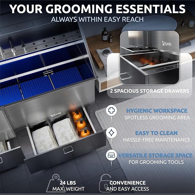 - SPACIOUS STORAGE & HYGIENIC SETUP: Two sliding drawers, each holding up to 24 lbs, provide generous space for grooming tools and accessories. Keep essentials within reach while maintaining a clean pet wash station with hassle-free upkeep