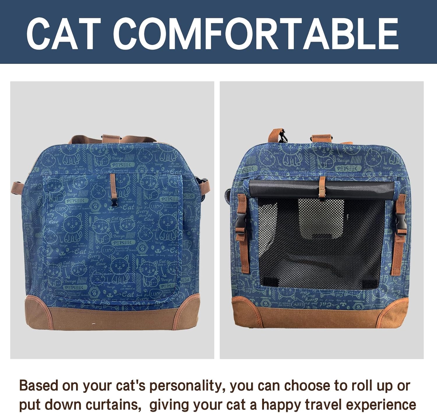 - UPGRADED VERSION- Remove the back side window and amplify the pocket.The front and two side windows add curtains which can be rolled up. Provided a concealed space for cats. Adding cute cat pattern on the cat carrier.