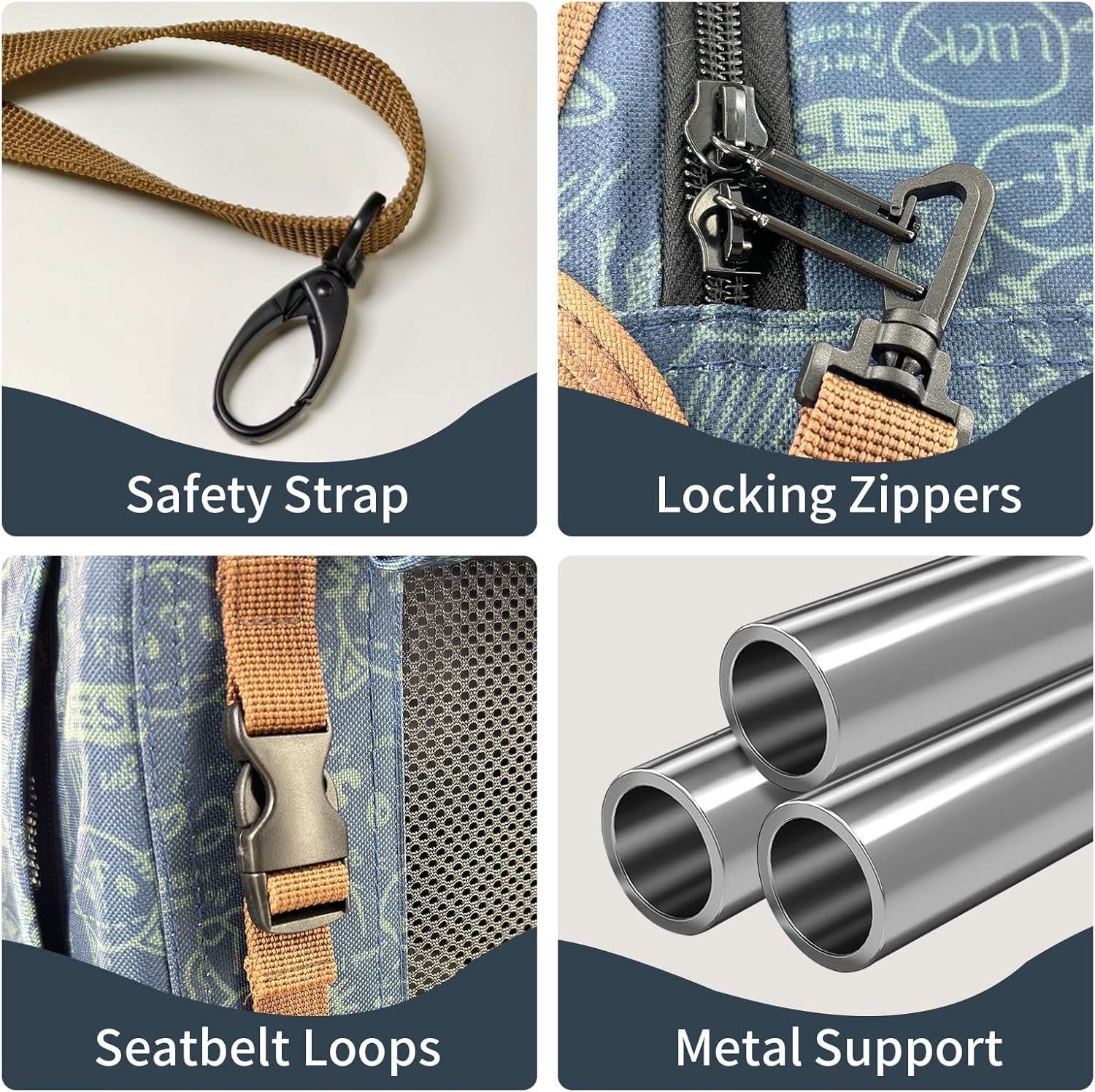 - SAFETY DESIGN- Each access has a zipper lock to prevent cats from escaping. On the side have seatbelt loops, can fix the carrier in the car. The internal metal support structure may also provide good protection for pets.