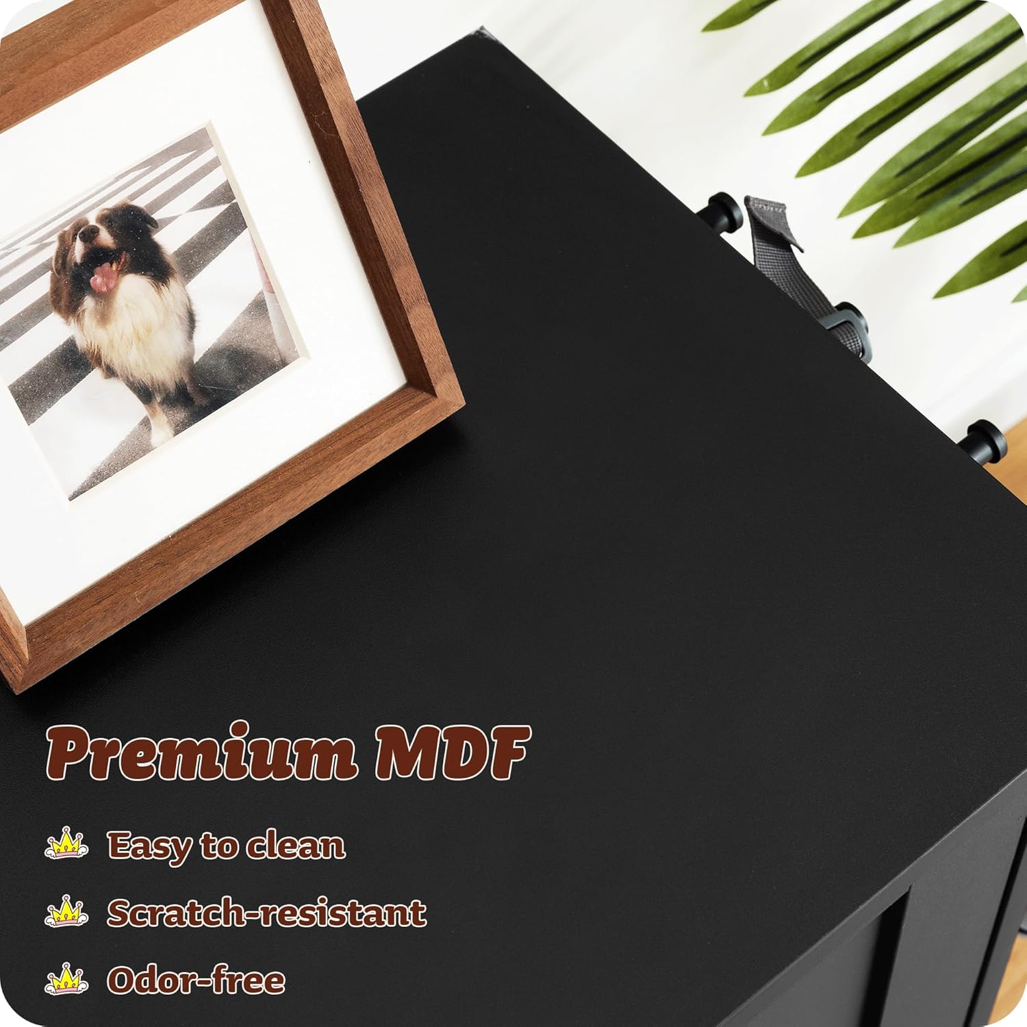 - Perfect Storage Solution: Dog bowl cabinet for dog food and snacks, tabletop for pet toys and photo frames. Side hanging rods for leashes and collars. Place this dog station in your kitchen, entryway or apartment to keep your dog's area neat and organized