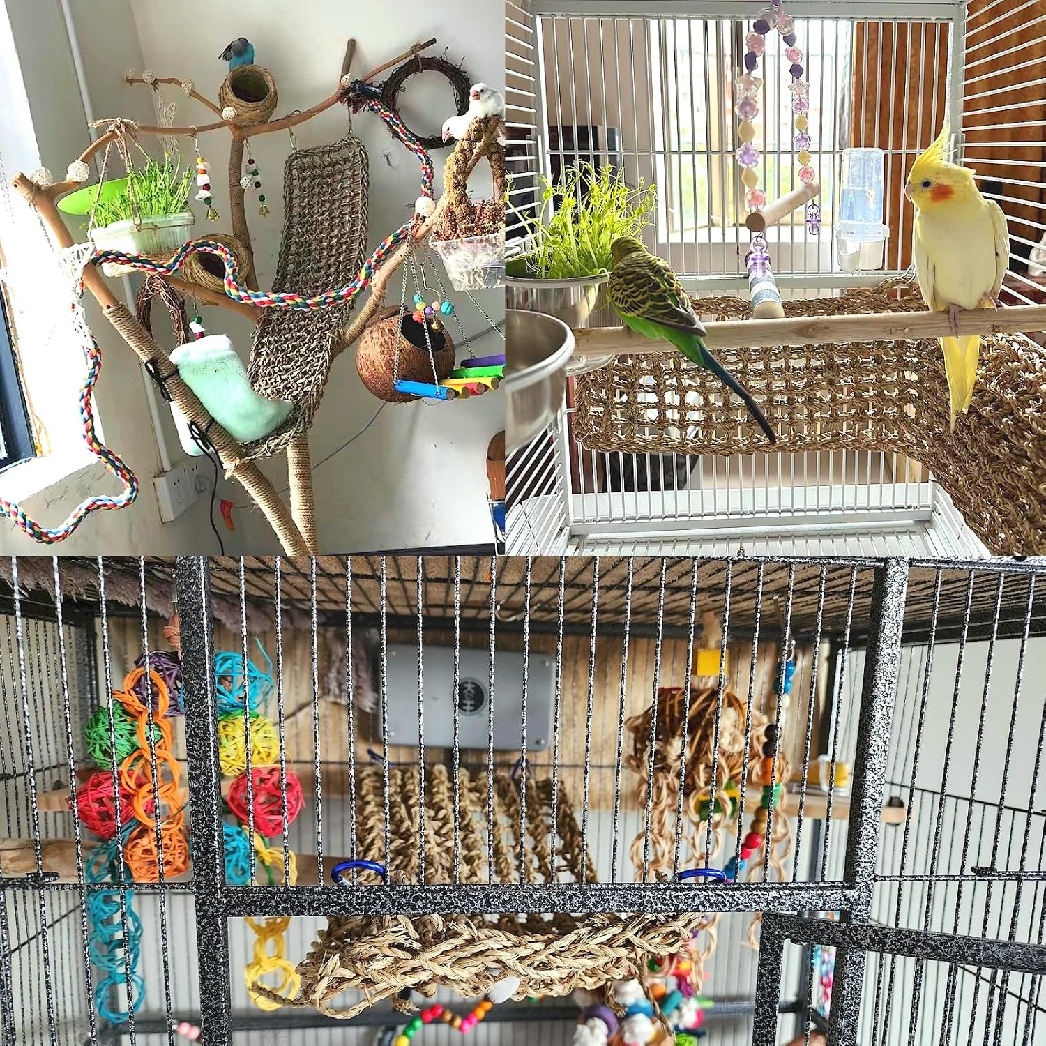 - 【DIY Bird Foraging Wall】Our seagrass hammock has hooks that can be easily hung on the cage. You can play with your imagination and hang some toys and decorations on the mat to attract your birds, who will perch, walk, chew or rest on the seagrass mat.