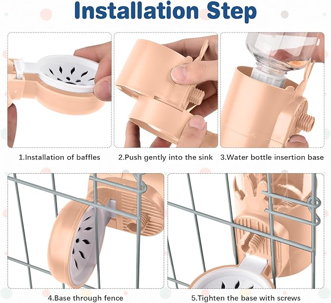 - 【Automatic Water Outlet and Suspension Design】The guinea pig water bottle features a gravity flow siphon design and a hanging water bottle to control water flow and prevent spills. If the cage or cage bars are warped, the water bottle will tilt, causing leaks. Our rabbit water fountains are easy to install, simply mount them in different locations and keep them level.