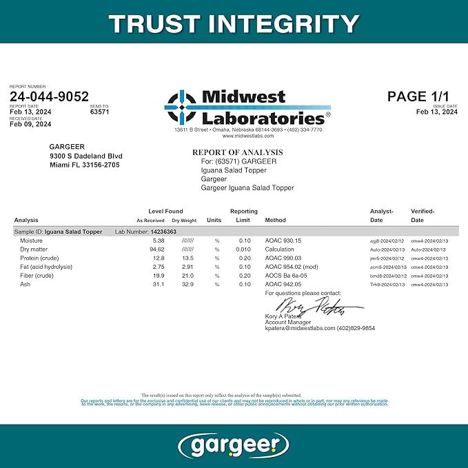 - ESSENTIAL NUTRITION: Elevate your Iguana's health with our SALAD TOPPER. Packed with premium ingredients like Alfalfa Leaf Powder, Dandelion, and Calcium Carbonate, it provides essential nutrients for optimal health and well-being.