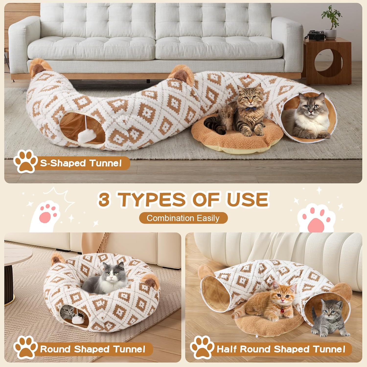 - Multifunctional Playground Toys: Keep your cat entertained for hours! The Morikey cat tunnel bed can be shaped into a circle, S-shape, or semi-circle, catering to your pet's playfulness. With two interactive toy balls included, it's the perfect setup for multi-cat play, ensuring endless fun and engagement. Embrace the ideal blend of style, comfort, and fun, and give your pet the luxurious retreat they deserve.