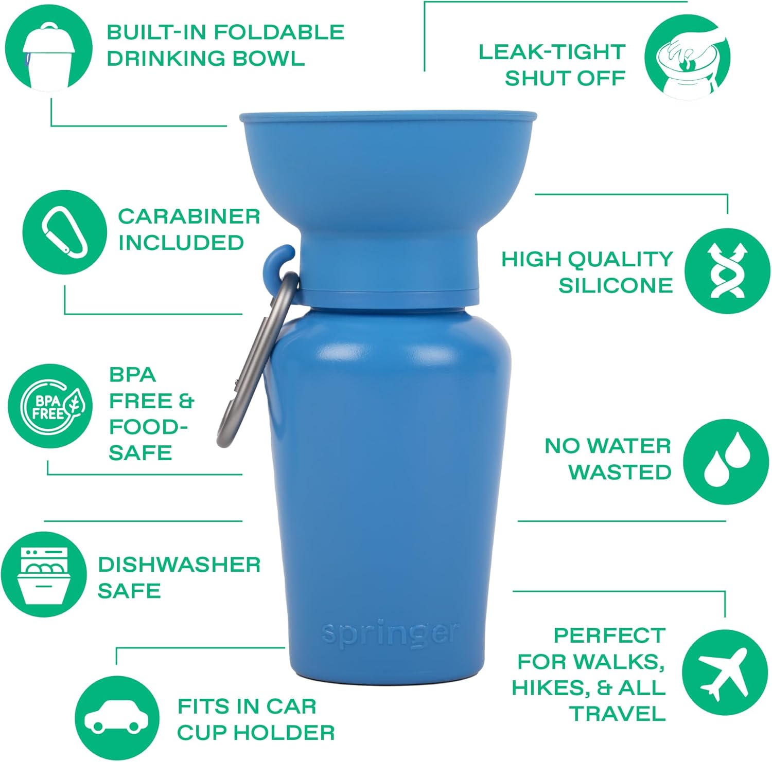 Springer Flip Portable Dog Water Bottle with Foldable Food Grade Silicone Bowl - 20 Ounce Travel Dog Water Bottle Ideal for Camping - Easy Squeeze Hydration & Release to Drain