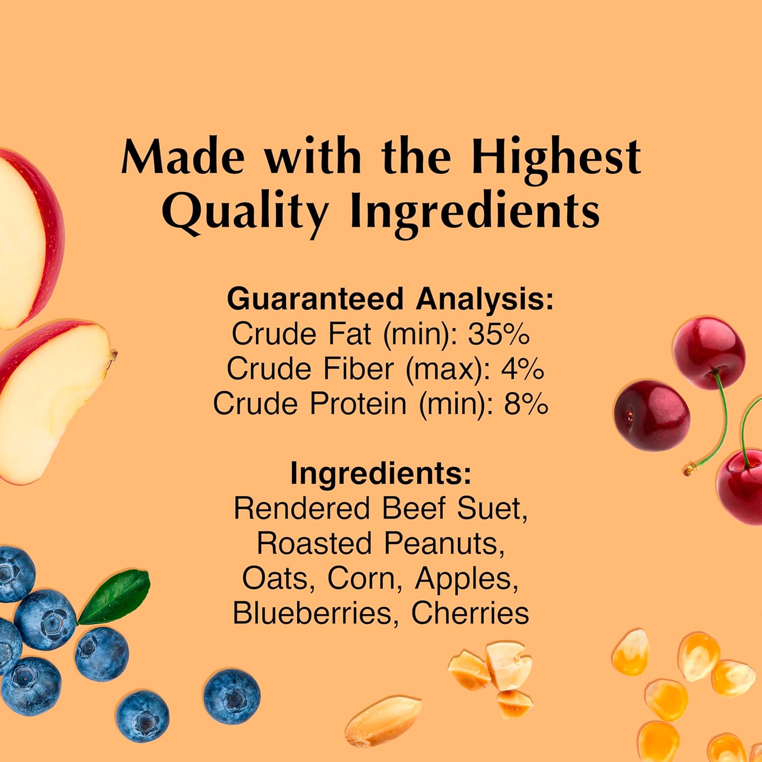 - MADE WITH REAL FRUIT for a nutritious diet. Suet cakes provide the essential energy and calories birds need to forage, nest, migrate and more.