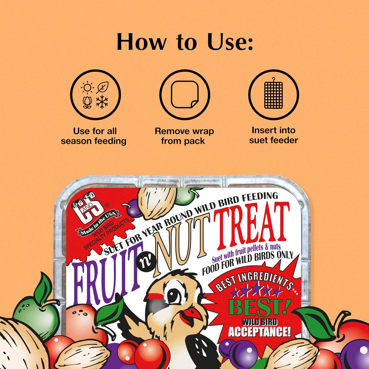 - ECONOMICAL & EASY TO USE compared to traditional seeds. C&S Fruit n’ Nut Suet Treat combined with a suet feeder, offer great value for today’s wild bird feeding customer.