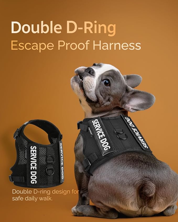 - ESCAPE-PROOF AND EASY TO WEAR - This ESA harness for dogs featuring a quick-wear design, just fasten the side buckles and put it on in seconds. It is more secure and ensures that your puppy will not break free.