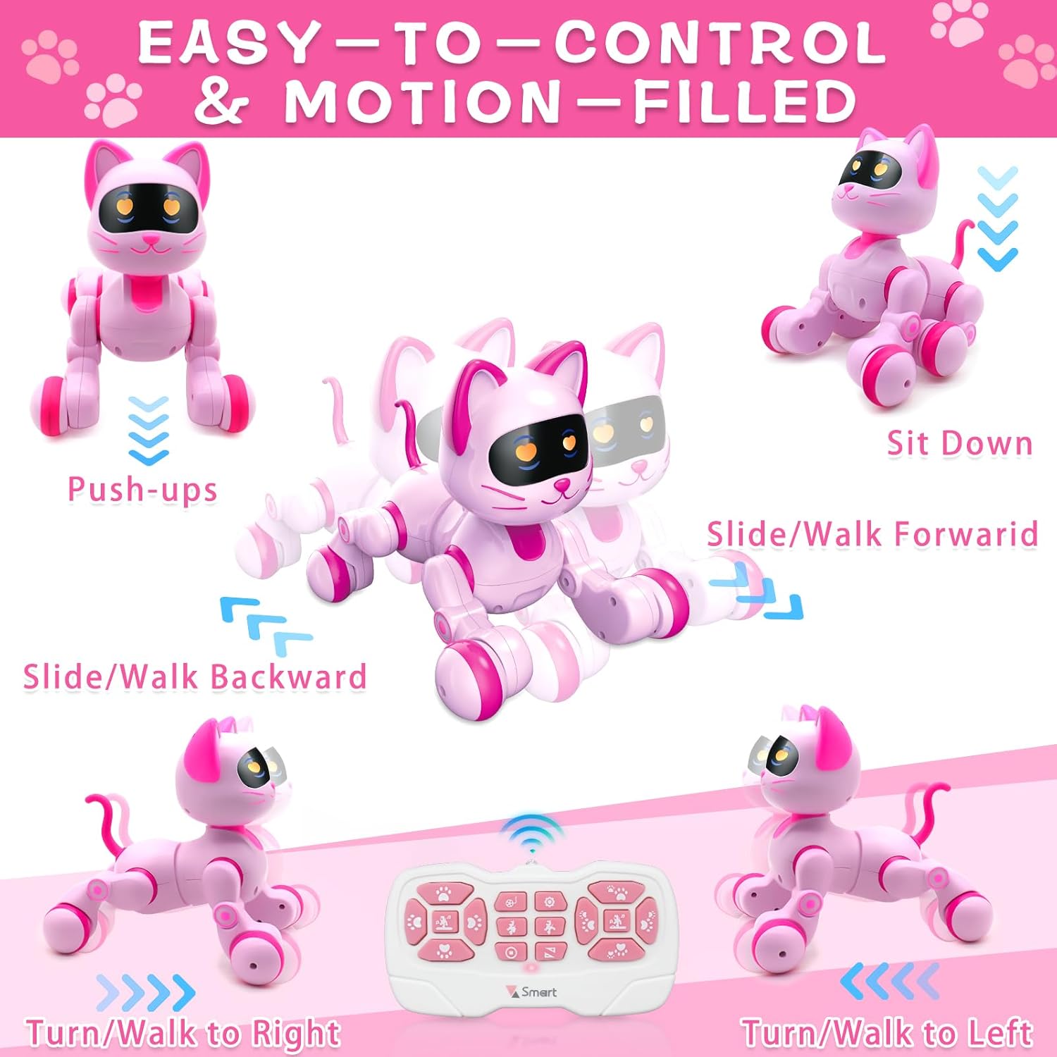 - Motion-Filled with Rechargeable RC Pet Cat: Rechargeable RC pet cat that moves forward, backward, slides left and right, walks, sits down, and pushes up. Powered by a rechargeable 3.7v 400mAh battery, it provides 1 hour of play time. The remote control requires 2 AAA batteries (not included)