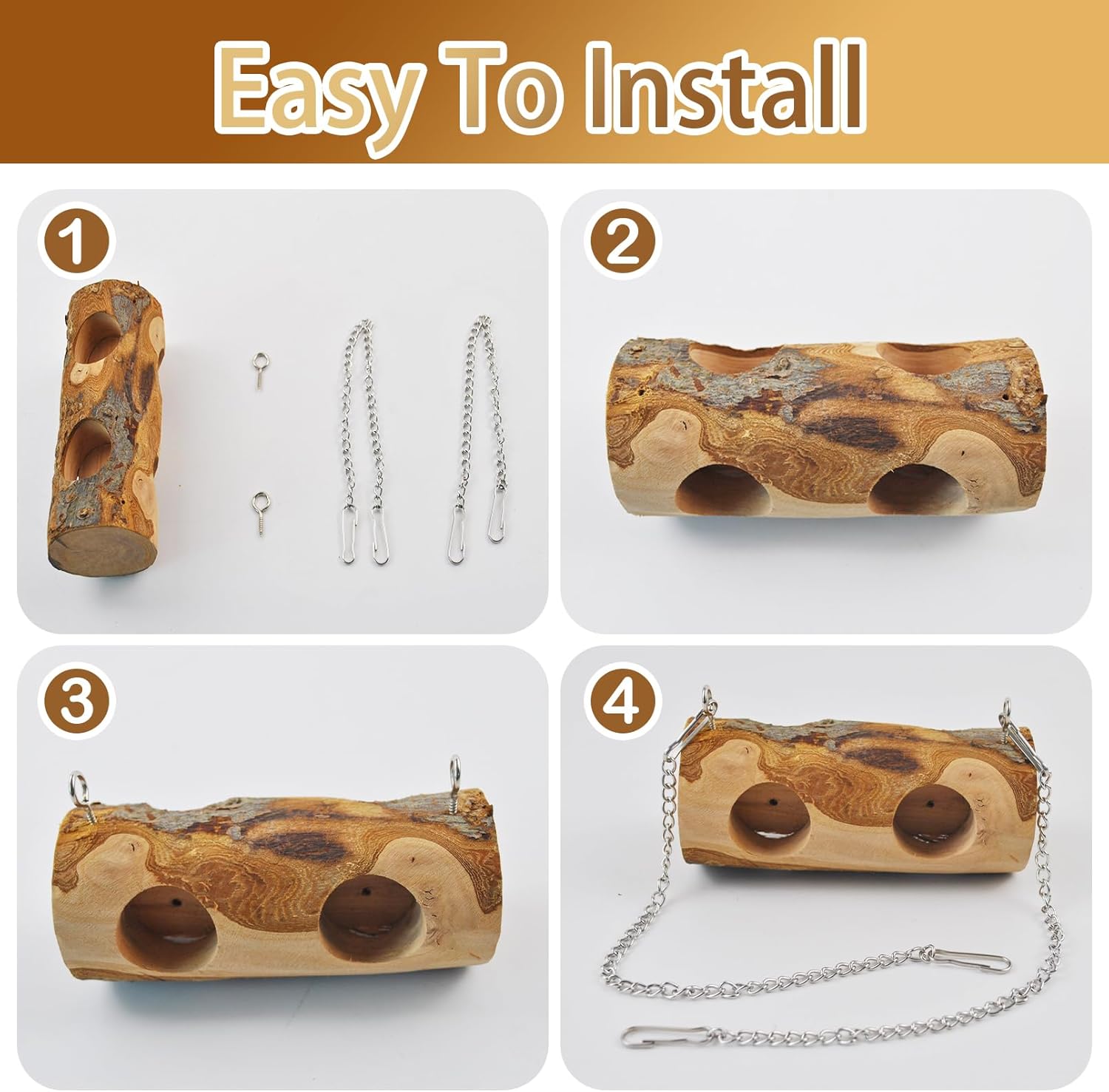 - 3 In 1 Parrot Toy:Hanging bird swings is good for bird to sharpen beaks & play on wood bird swings. Bird's beak is growing,need to chew to ensure that beak doesn't grow too long.Small hole of parakeet perch swing in design can placed food,to use training pet to forage