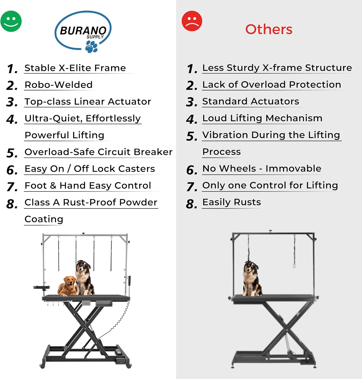 - INNOVATIVE STRUCTURAL UPGRADE - Introducing the Burano X-Elite Premium Dog Grooming Table: a major upgrade from traditional X-lift to advanced functionality. Boasting a sleek design with innovative features, it ensures stability for all pet sizes and seamless grooming from any angle. Crafted for excellence, it allows groomers to focus on their artistry.