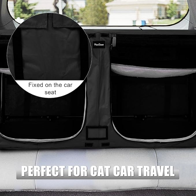 - [Foldable & Portable Cat Carrier]: The twin Compartment cat show house can be easily folded and stored in the provided carry bag, allowing you to conveniently take it to beach, park, campsite and so on. The fixed belt on the back can combine with the car seat belt to affix the carrier, making the unit and pets secure while driving.