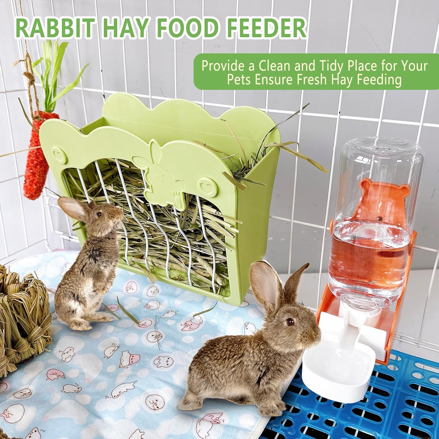 - 【2-IN-1 Food & Hay Feeder】This is a feeder designed for small animals like Guinea Pig, Rabbit.Our water dispenser is suitable capacity water feeder, Water bottle holder is suitable for most cages.To keep your rabbits well-hydrated, this set includes a 500 ml hanging gravity water dispenser. The automatic water bottle ensures a constant supply of clean water without the need for frequent refills. It attaches easily to the cage, allowing your bunnies to drink whenever they want
