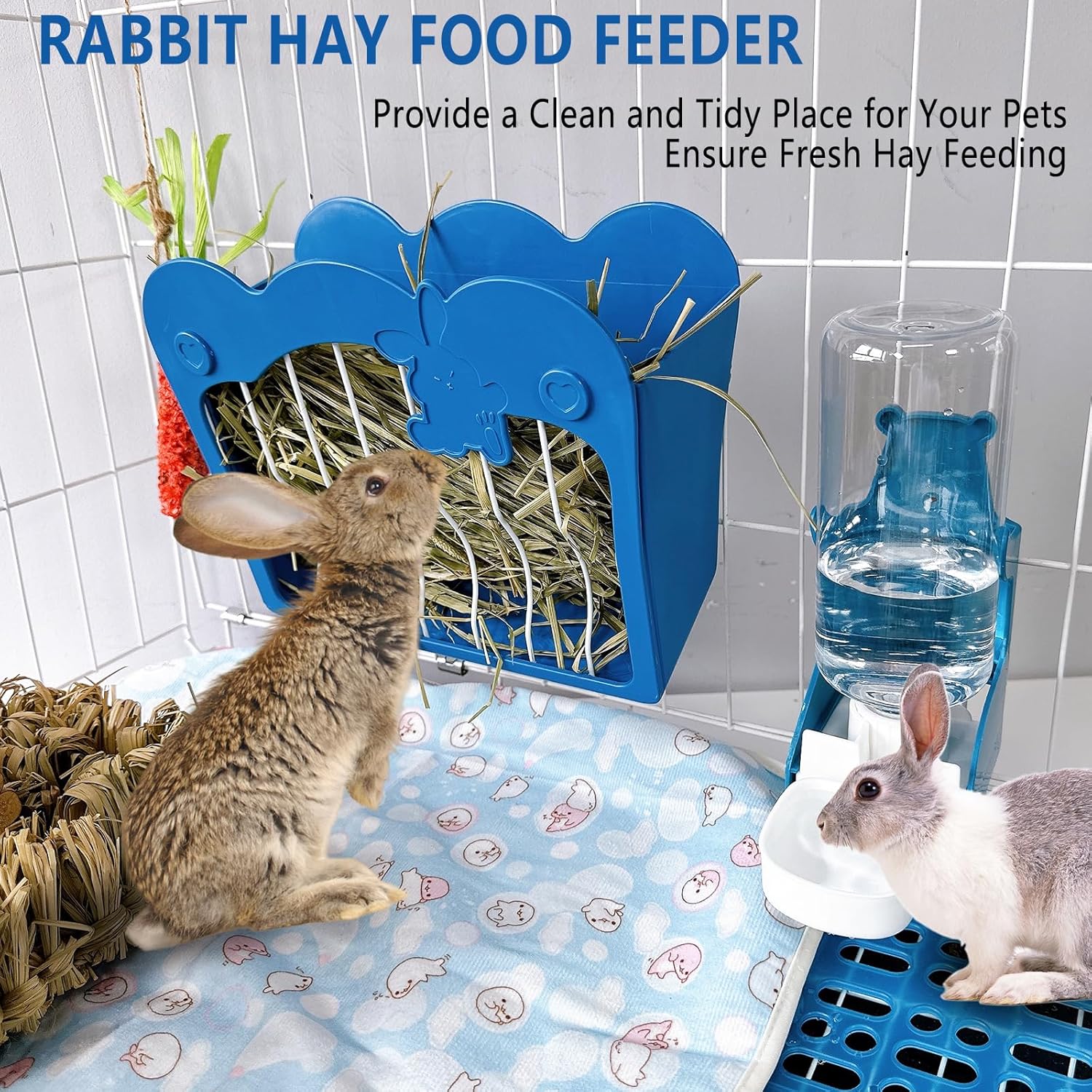 Hamiledyi Rabbit Hay Feeder 500ml Hanging Gravity Water Dispenser Guinea Pig Grass Rack Water Bottle Set for Bunny Ferret Chinchilla(Blue)