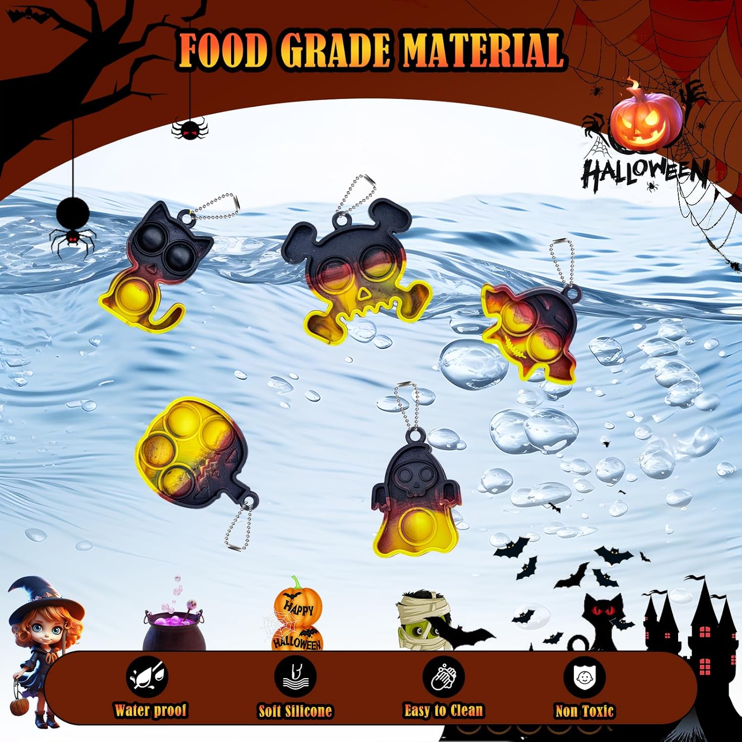 - Halloween Goodie Bag Fillers for Kids: Halloween mini pop keychain fidget toys are made of food grade silicone material, non-toxic and tasteless, safe and soft, waterproof, easy to clean. Halloween pop keychain with chain that can be fastened on a backpack for easy carrying, you can play and squeeze anytime anywhere. Bulk halloween pop toys for kids party favors, it help relieve stress, targets anxiety, ADHD, autism, OCD toys, improve concentration. Perfect kids party favors toys gifts idea.