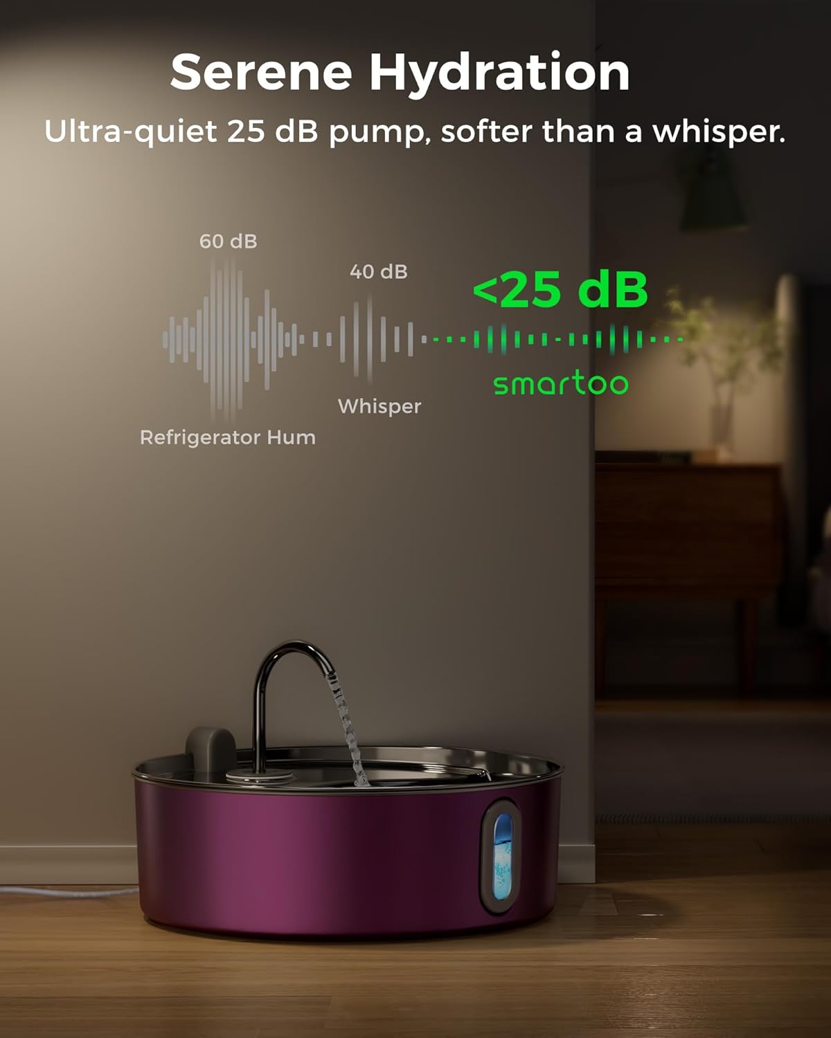 - Enjoy Peaceful Hydration - Our stainless steel pet fountain features an ultra-quiet pump that operates at just 25dB, which is softer than a breath and quieter than a whisper. It won't disturb your sleep, reading, or startle your pet