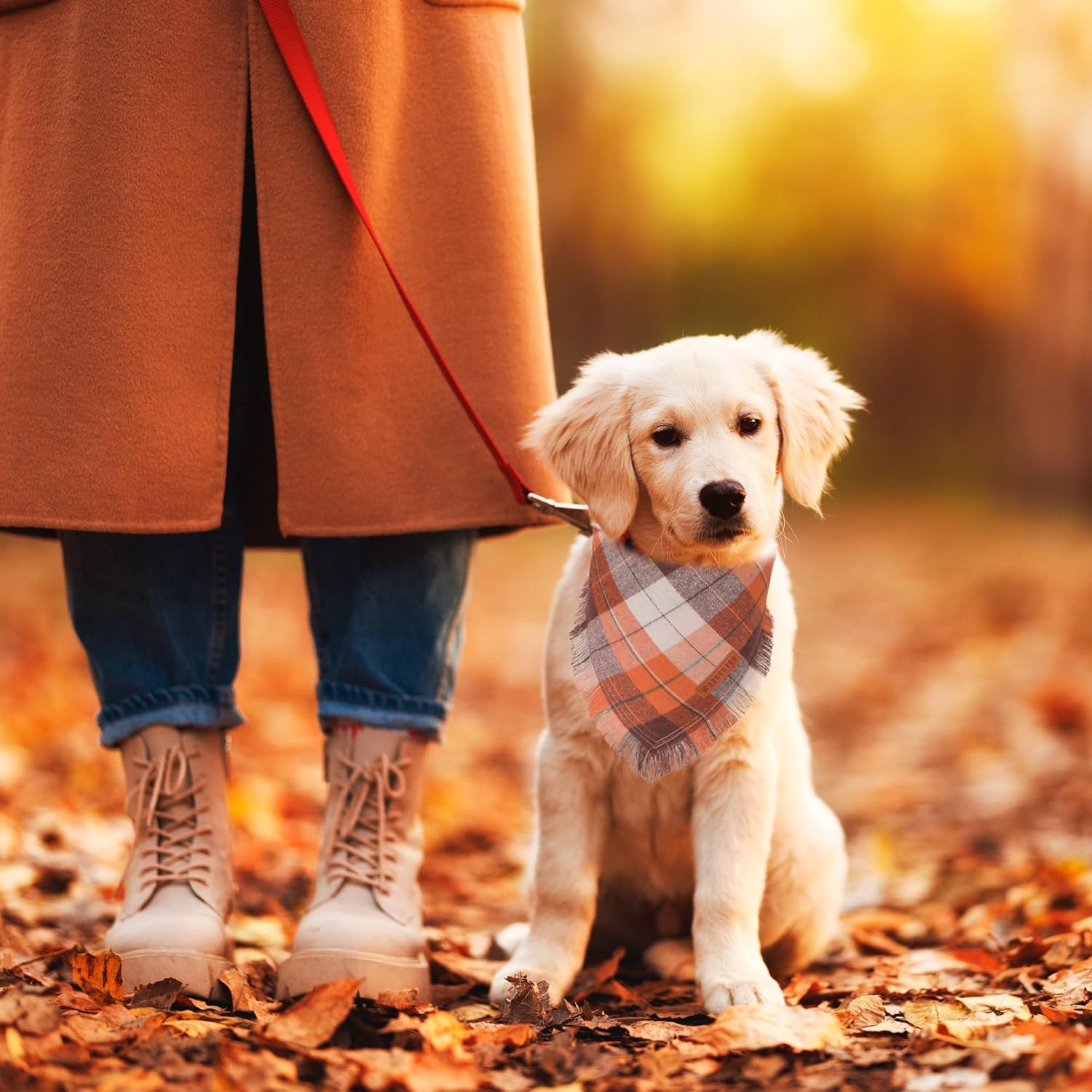 ADOGGYGO Fall Dog Bandanas with Tassels Edges, Stylish Plaid Pet Halloween Thanksgiving Scarf Bib, Orange Plaid Fall Bandanas for Small Dogs Pets (Small)