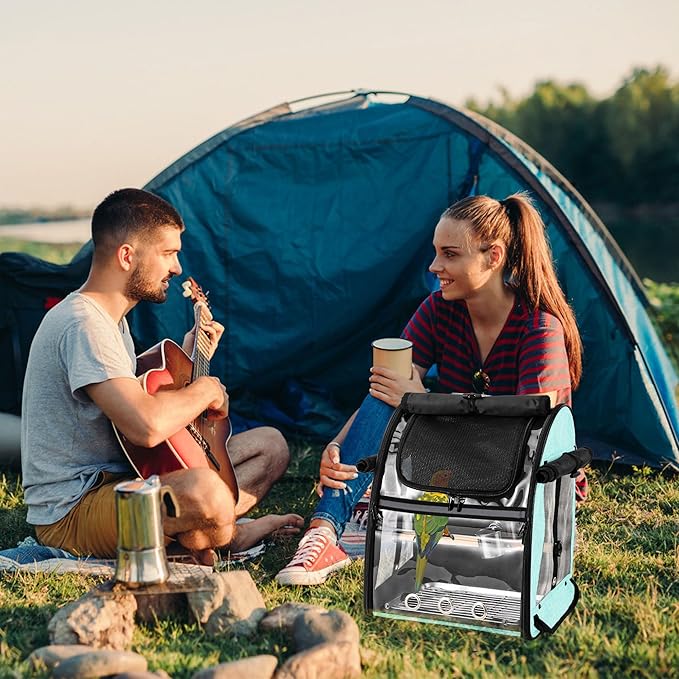 - 【STAINLESS STEEL MESH】 Roll up the sunshade of the bird travel cage and fix it. You can check the status of your bird at any time through the transparent window. The side of the bag is equipped with anti scratch 304 stainless steel mesh to ensure sufficient air circulation and no bird can chew it out.
