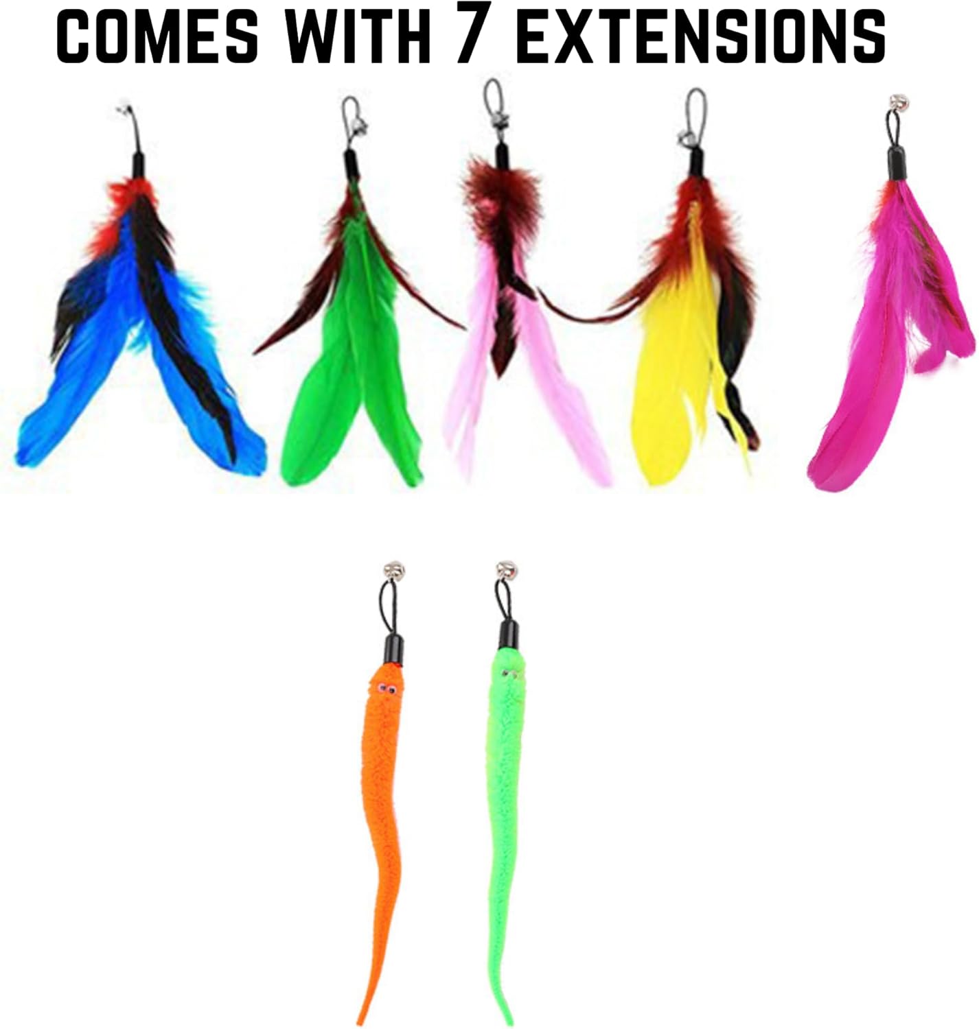 - HIGH QUALITY: High quality and Safety: Our Cat toy fishing pole is created from safe and eco friendly natural materials. The feathers and cat wand are designed for high elasticity and durability. The metal clasp is easy to open and close for changing feathers. The package includes 2 cat wands, 9 feather worm refills, that have bells attached to them and 2 extra strings with clasps, ensuring long-lasting playtime. Our cat toys wand is perfect gift for cats!