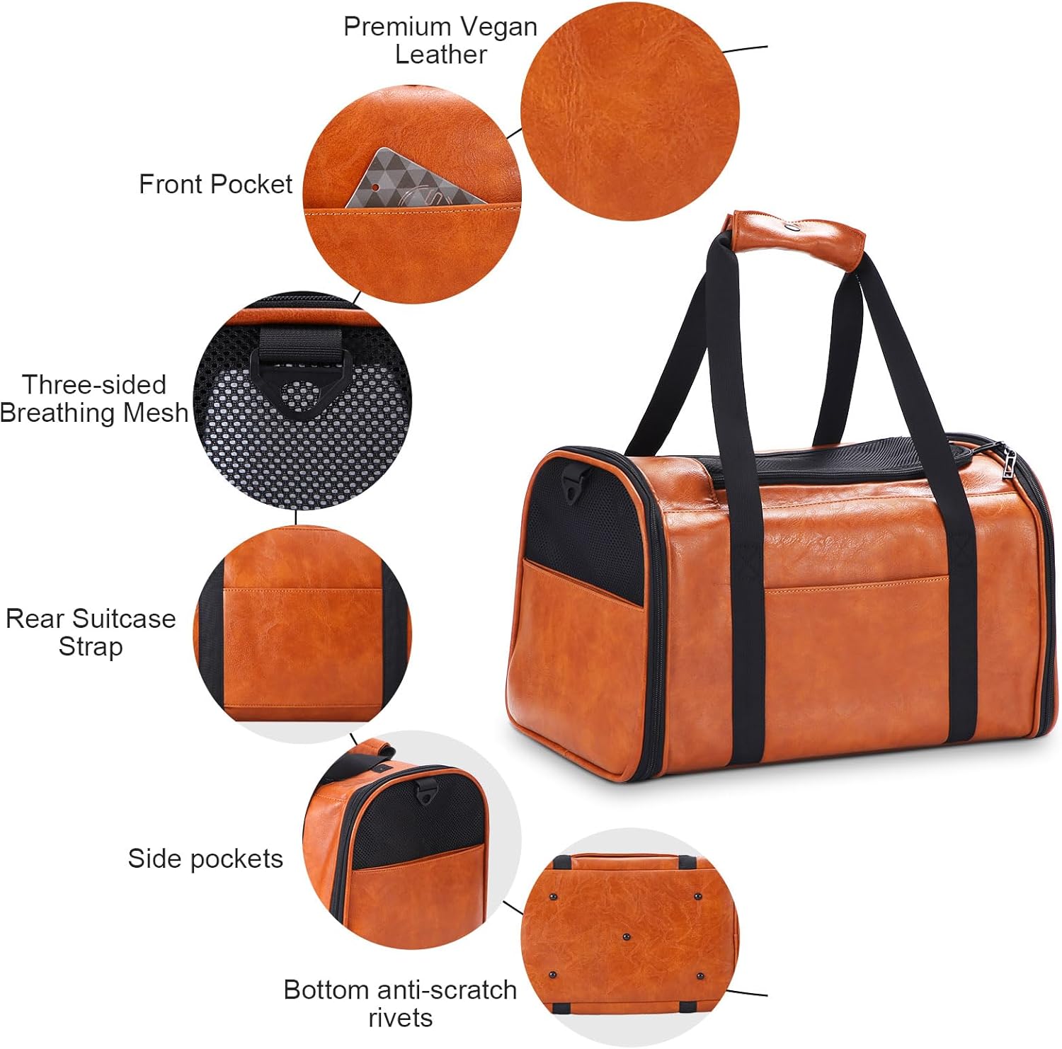 Fashion Leather Dog Carrier Cat Carrier Airline Approved Pet Carrier for Small Medium Dogs Cats Under 15Lbs, Collapsible Soft Sided Travel Puppy Carrier Brown