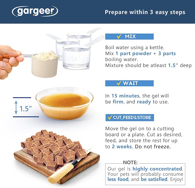 - YOU GET MORE. Gargeer gels are complex nutritional formula that come as a concentrated powder, and gel when you add boiling water. You can now prepare a moist food for your animal that is superior to any dehydrated flakes or pellets. 3 oz of powder makes roughly 1 pound of ready to use product.