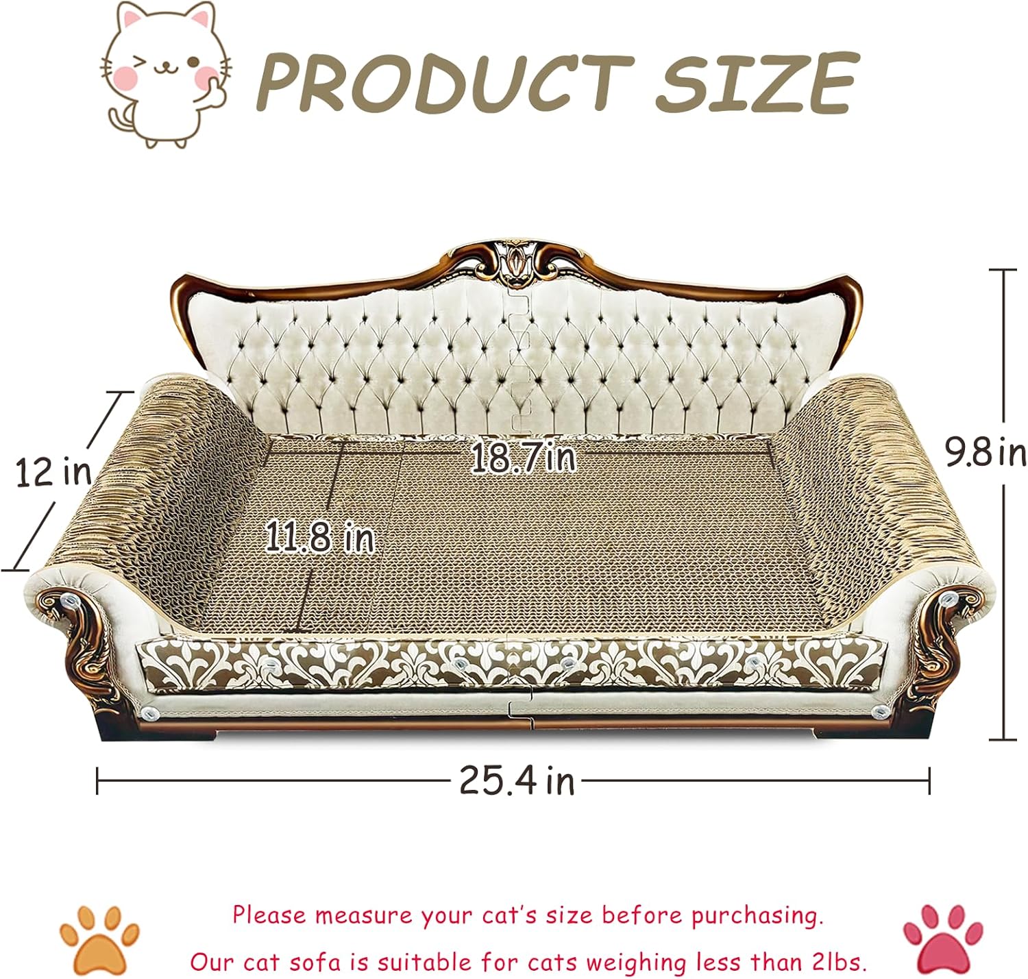 - Lovely & Luxurious Cat Scratcher Sofa: Perfect for small, medium and large cats weighing less than 22 lbs. Give your cat royal experience. The cat sofa's dimensions: 25.4” L * 12” W * 9.8” H (check picture for right size reference)
