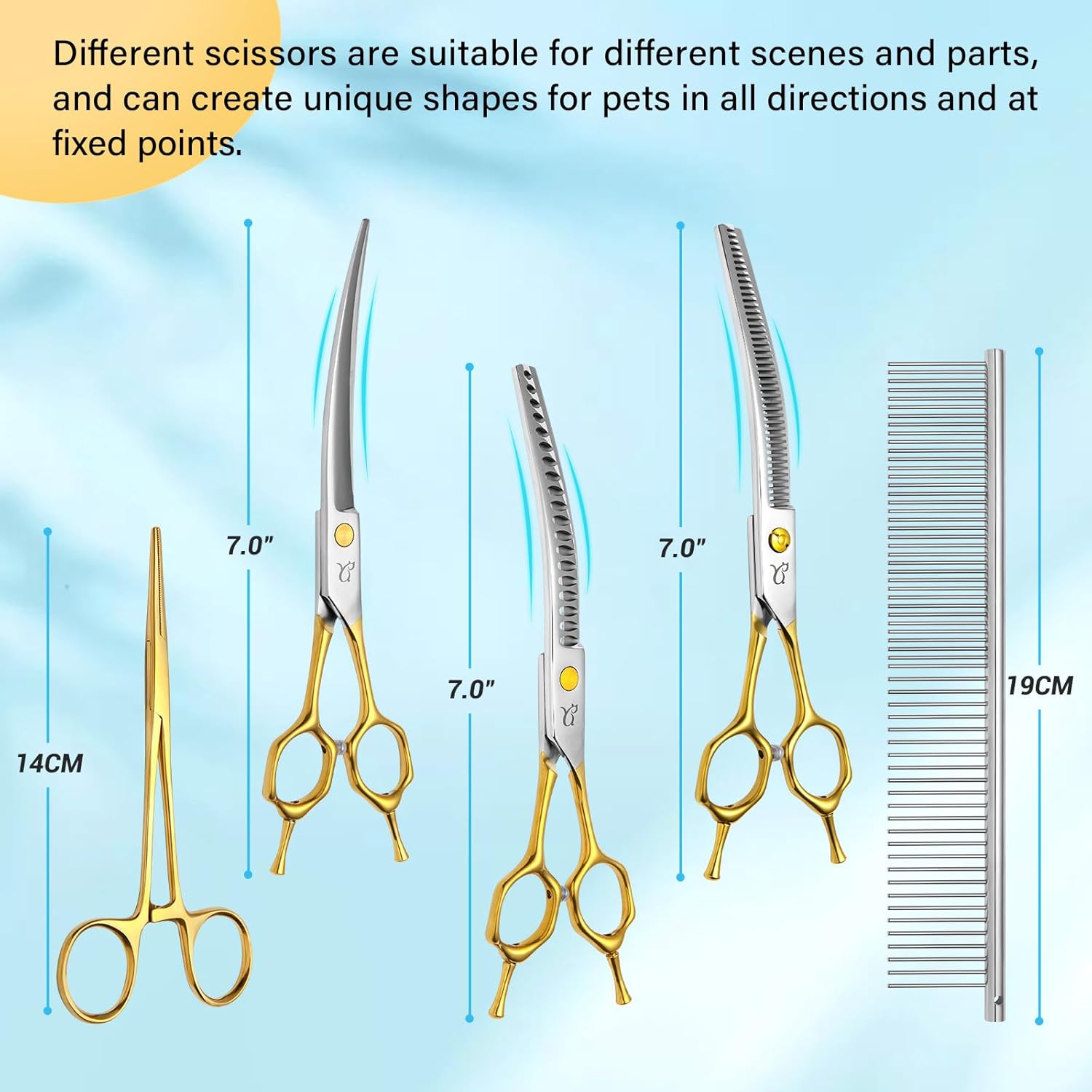Dog Grooming Scissors,Curved Thinning Shears Curved Chunkers Shears with Safety Round Tips, Sharp and Comfortable 4 in 1 Dog Scissors for Grooming