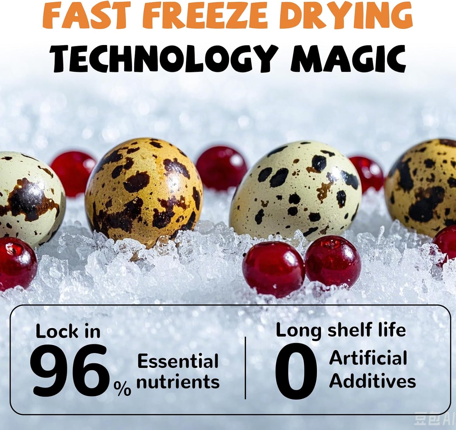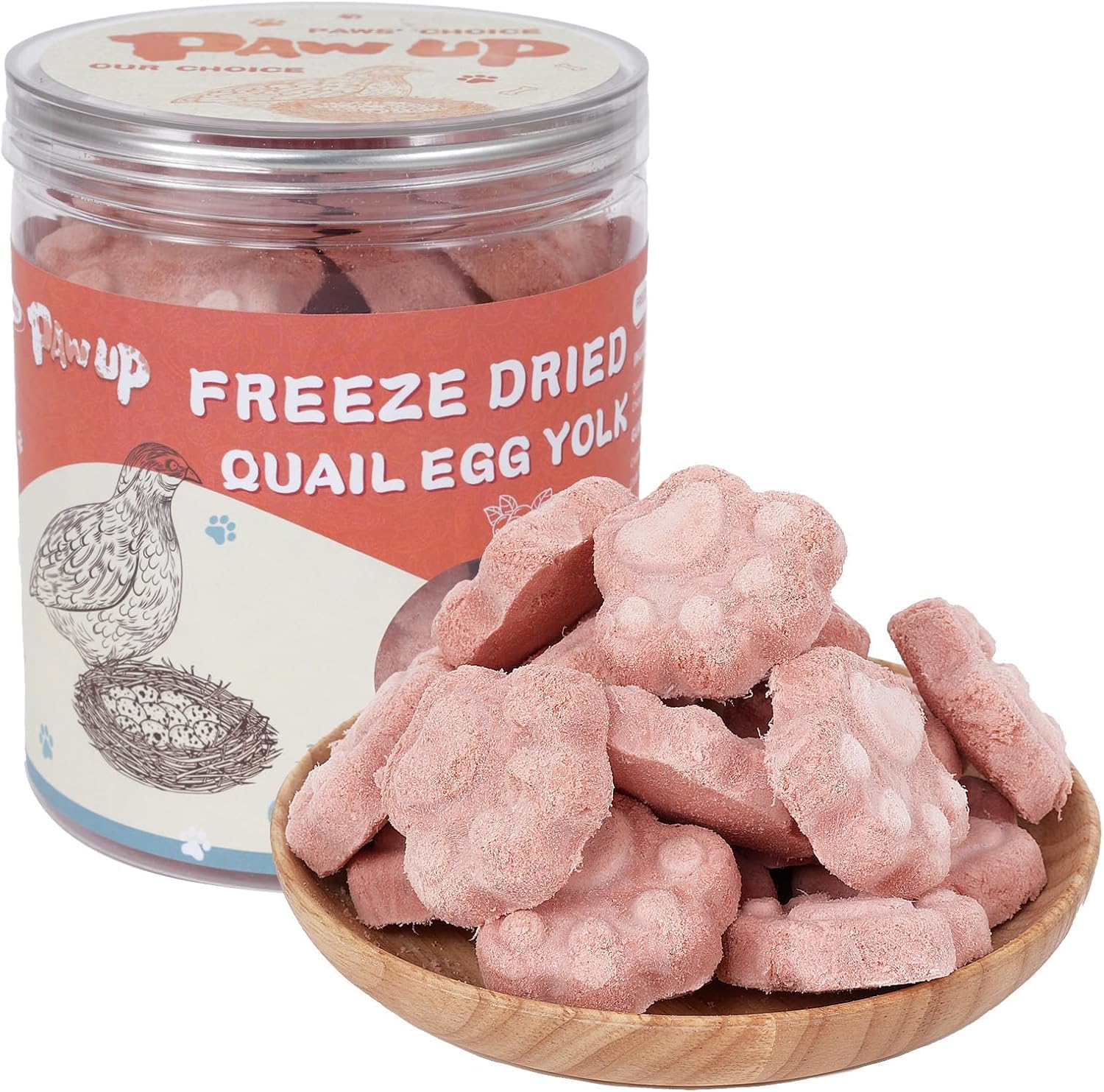 - Premium Quail Egg Yolk: Pawup's freeze-dried treats use free-range, non-GMO fed quail egg yolks and nutrient-rich cranberry. This combination delivers a pure, concentrated protein source with a 5:1 raw-to-finished ratio. Strictly tested and certified by SGS, BRCGS, and UKAS, ensuring top-tier safety and quality in every bite
