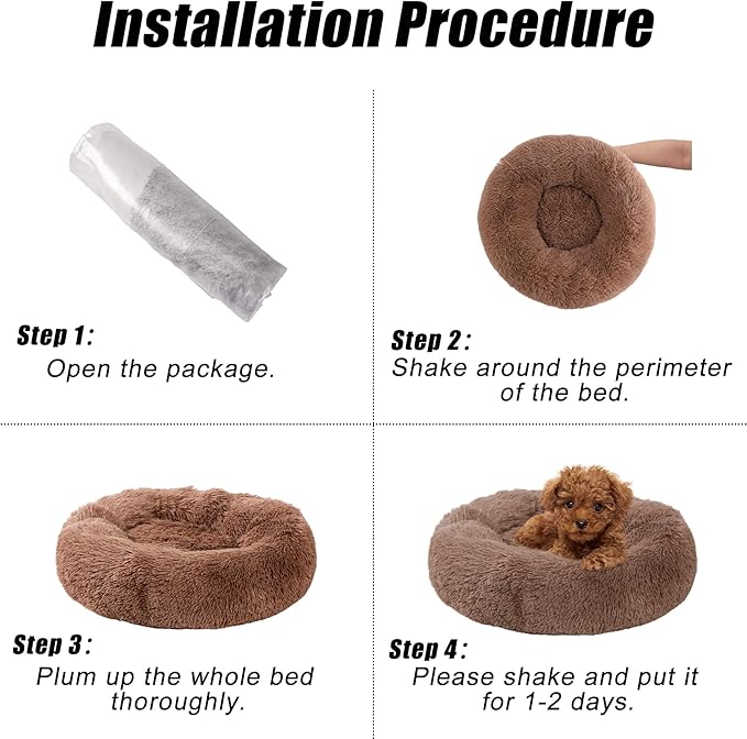 - 【How to Restore Fluffy】Our donut dog bed are vacuum packed with very good pp cotton, calming dog bed will be compressed during transportation, please air dry the round dog bed in a sunny place for 24 hours before use. After air drying, pat and shake the puppy bed to restore its fluffiness. Or put the ped bed in the dryer at the low temperature drying for a few minutes, then give it a gentle pat and shake, and the soft dog bed will become completely fluffy.