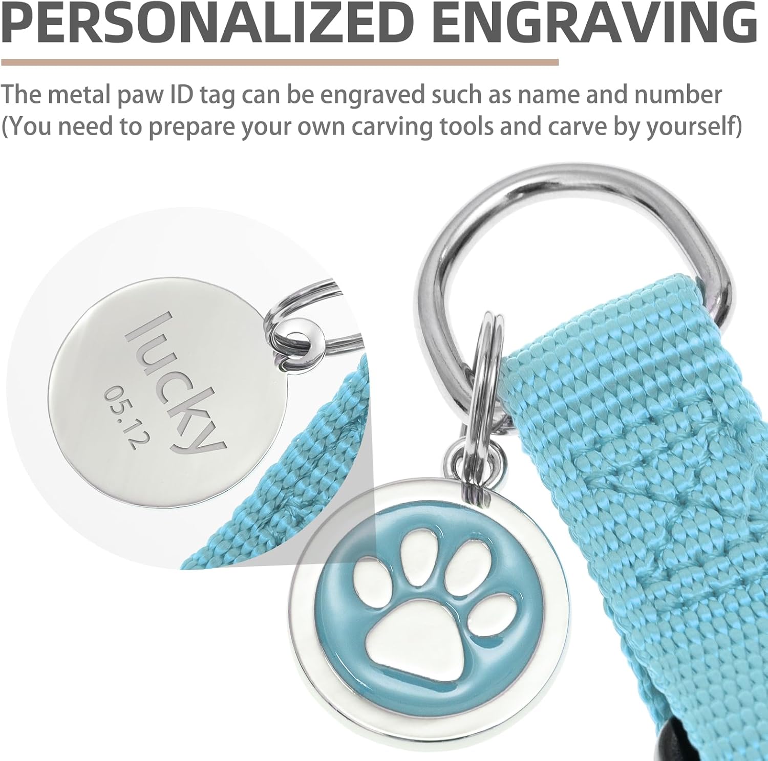 - [Cute ID Tag for DIY] - Each harness is equipped with a metal ID tag, and the front is a cute paw pattern, while on the back, you can engrave whatever you want, such as the dog's name and so on. It does not corrode as easily as wooden labels and is durable. You can also remove it when washing the harness.