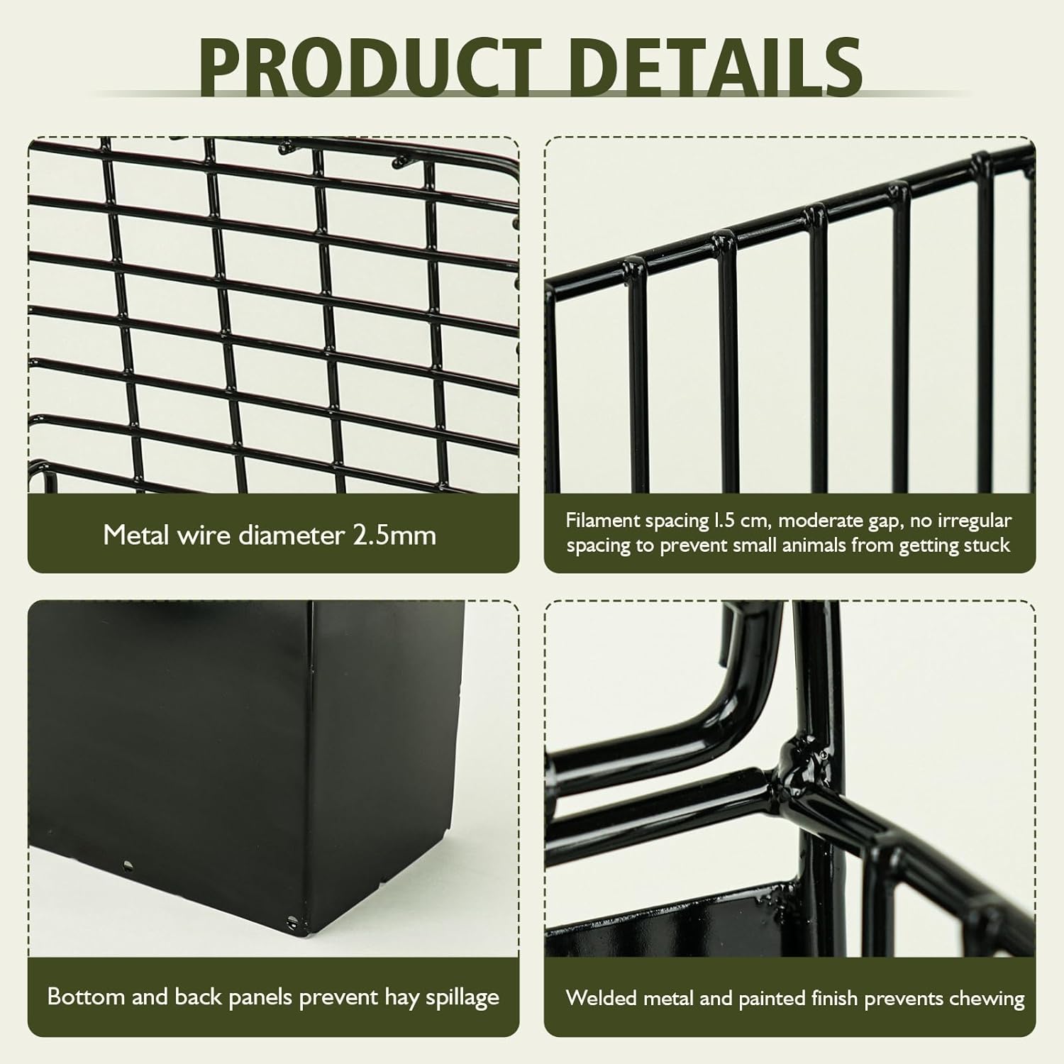 - Metal Material: This small animal hay rack is made of high quality and durable metal material, after multiple processes such as welding, grinding and spraying. The distance between the fine wires is moderate, the back and the bottom are made of metal plate, which ensures that the metal hay rack won't leak the hay during the process of using. The surface is smooth and burr-free, which won't cause any harm to the small animals, and it creates a relaxing, clean, and safe feeding environment.