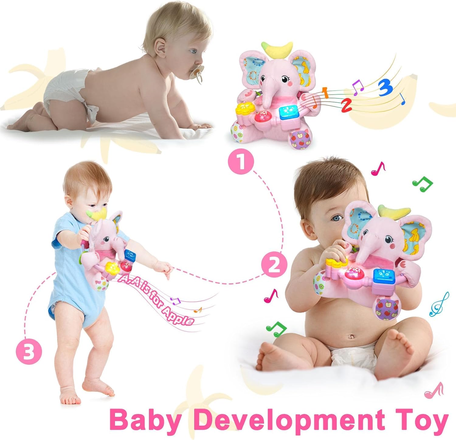 - Built for Fun:An easy-to-grasp bead ring hangs around the baby elephant toy.The bead ring has 3 buttons, Pressing these buttons activates flashing LED lights and learning of numbers 123,letters ABC, and playing 7 musical tracks. Additionally, there are 2 teethers located behind the grab ring, providing a variety of engaging experiences for baby toy 0-6-12 months.