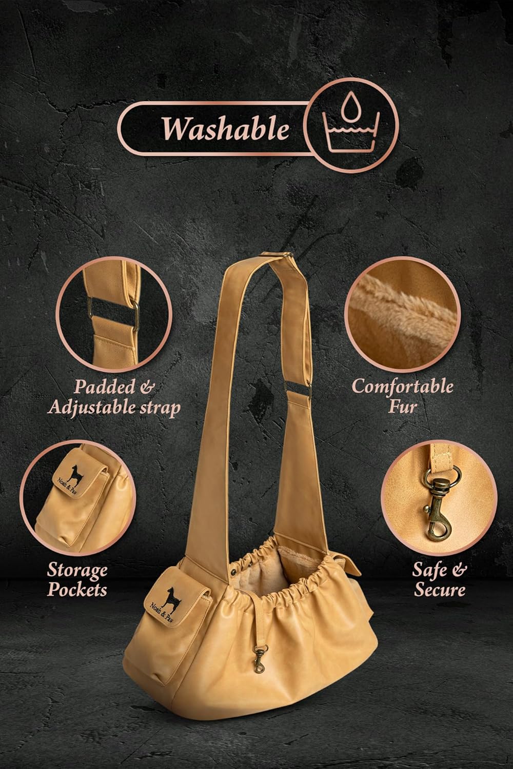 - Luxury dog sling carrier, fashioned from top-tier vegan leather. Designed with your convenience in mind, made with washable materials. This dog sling carrier combines style and practicality, to meet all your expectations.