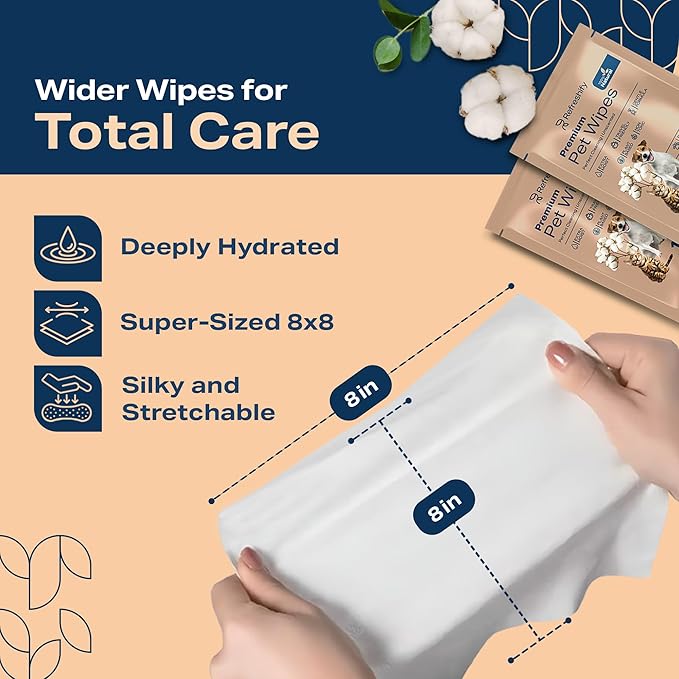 - GENTLE UNSCENTED PET WIPES - Refreshify dog grooming wipes are made with Vitamin E, Aloe Leaf, and Cantaloupe fruit extract, and Witch Hazel extract. Our dog paw wipes are for dogs and cats of all ages, sizes, and breeds. Perfect for cleaning up after a muddy walk or a quick refresh the park.