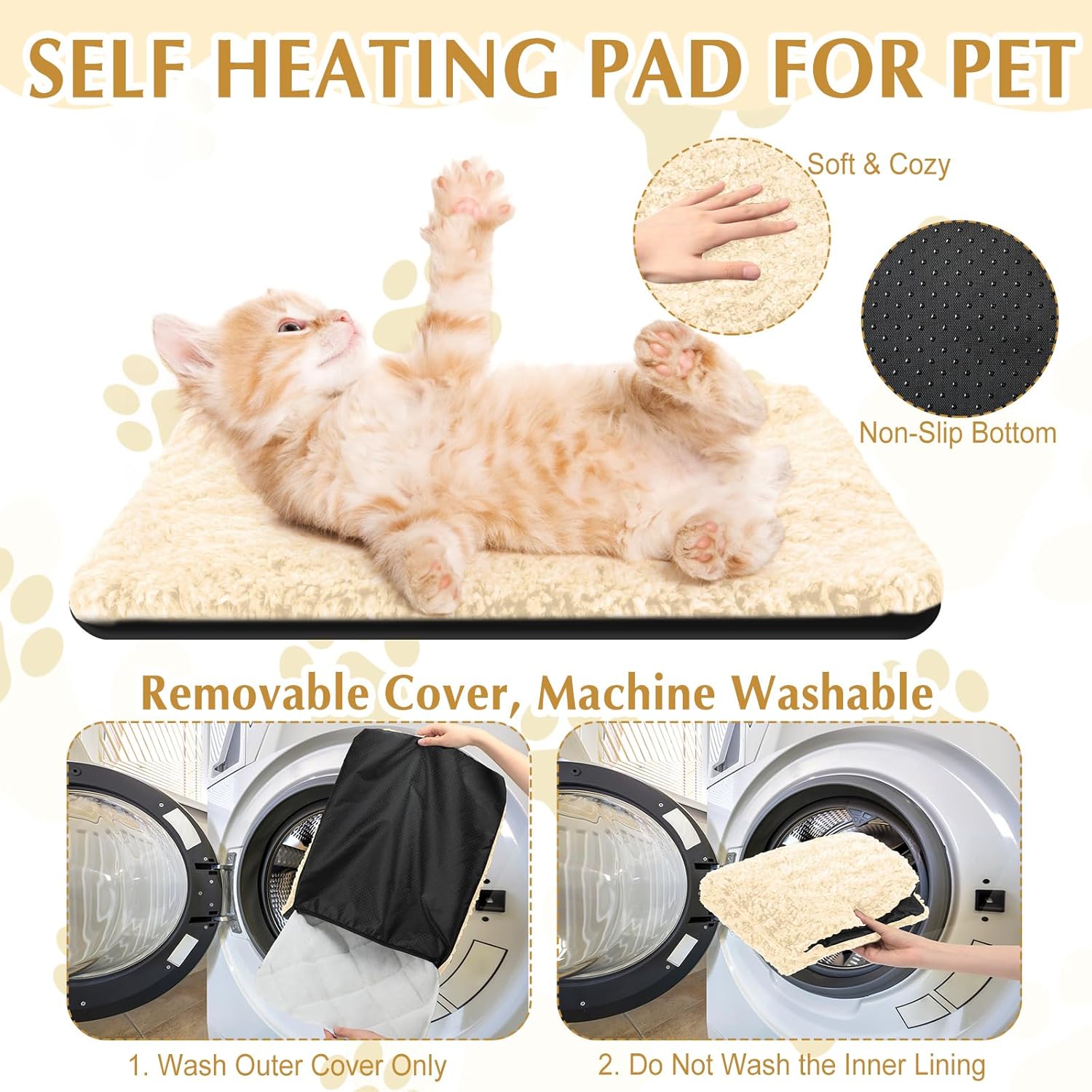 - Noiseless Material: the self heating cat pad's surface features cuddly soft fluffy fabric that is gentle on noses and paws for enhanced snuggling comfort, provides a snuggly surface for napping; It will not make crinkle sound; And a cotton filling that provides extra warmth and comfort; The anti slip bottom keeps the bed in original place, making the self heating cat bed safer for kittens and puppies to play or crawl on