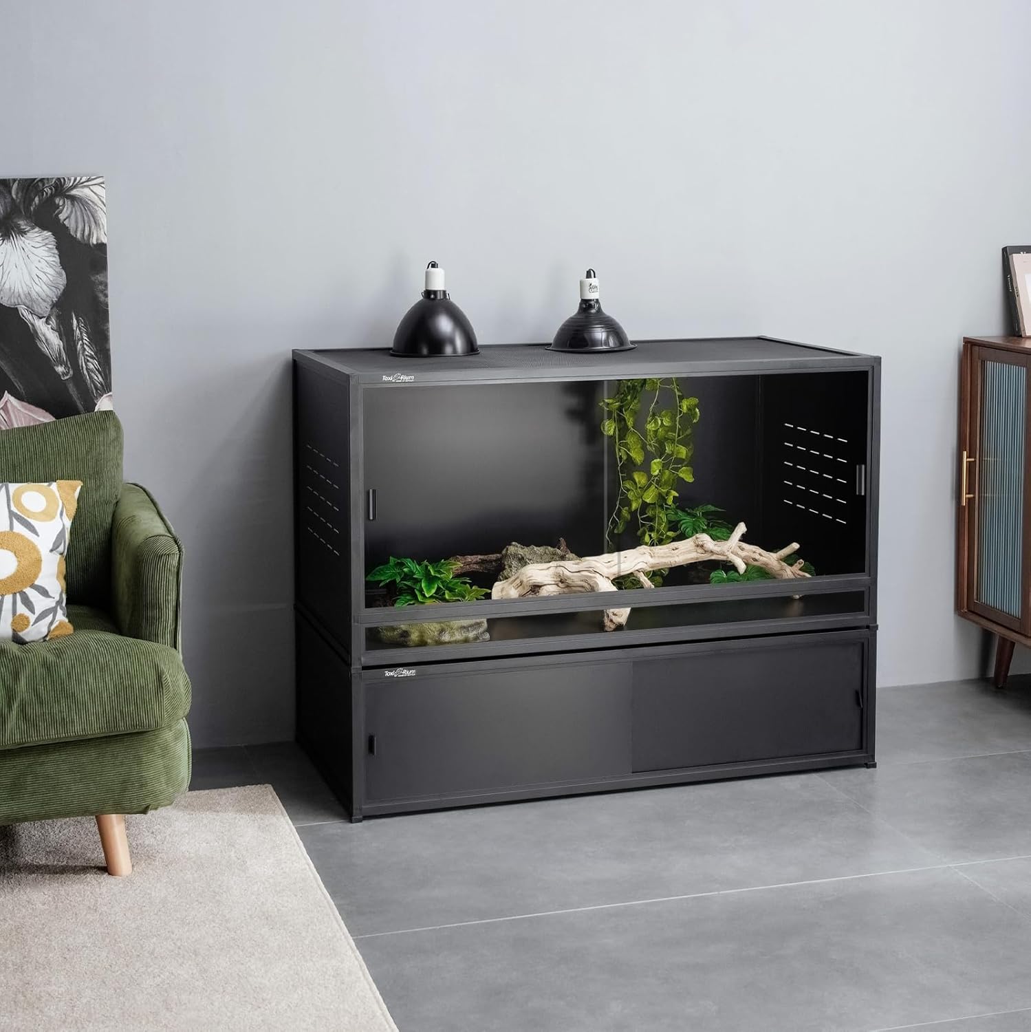 - Large Reptile Habitat Enclosure with cabinet: With spacious dimensions of 44"x20"x20" and an equivalent capacity of 76 gallons, Toxirium reptile habitat offers ample room for reptiles to explore, hide. The generous feeding area allows you to craft a comfortable and enriching environment for your reptile companion.
