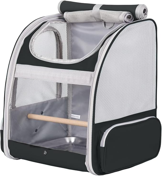 - Bird Carrier Backpack: Hands free backpack design, includes wooden standing perch and stainless steel plate.
