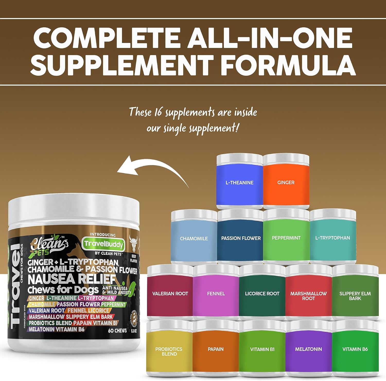 - Ginger Chews With Tryptophan Supplement: Make traveling easy with our dog supplement with ingredients like ginger root, l tryptophan, chamomile herb, passion flower extract, l theanine, peppermint extract, valerian root capsules, fennel seed, and marshmallows. Our blended formula also includes slippery elm for dogs, probiotic, papain, vitamin B1, vitamin B6, and melatonin 10mg for additional support to keep your dog at ease when on the move.