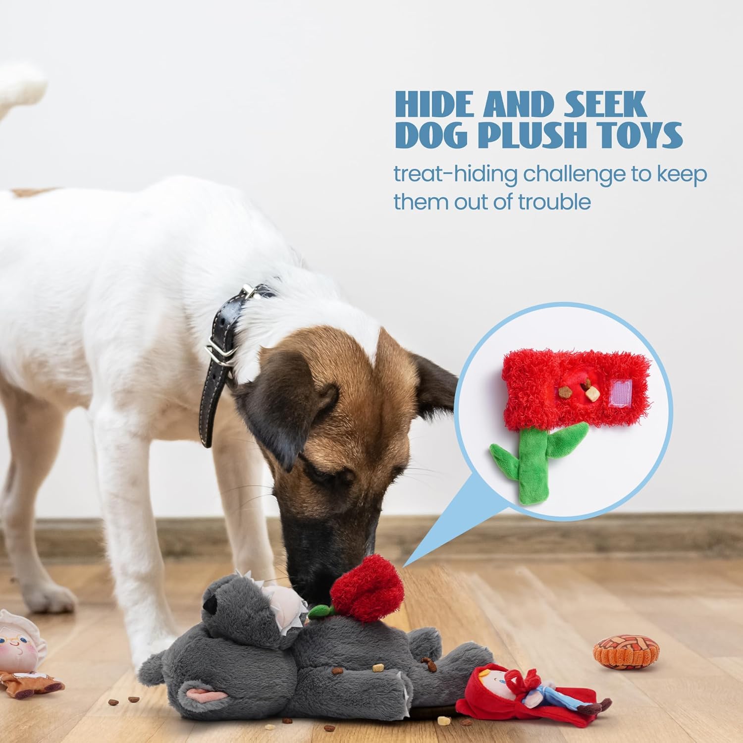 - 6 in 1 Plush Dog Toy Set: Includes six fairy tale-themed small dog toys from the Little Red Riding Hood story, each puppy toy featuring unique elements like crinkle, squeaky, and hide and seek, all stored within one large dog toy