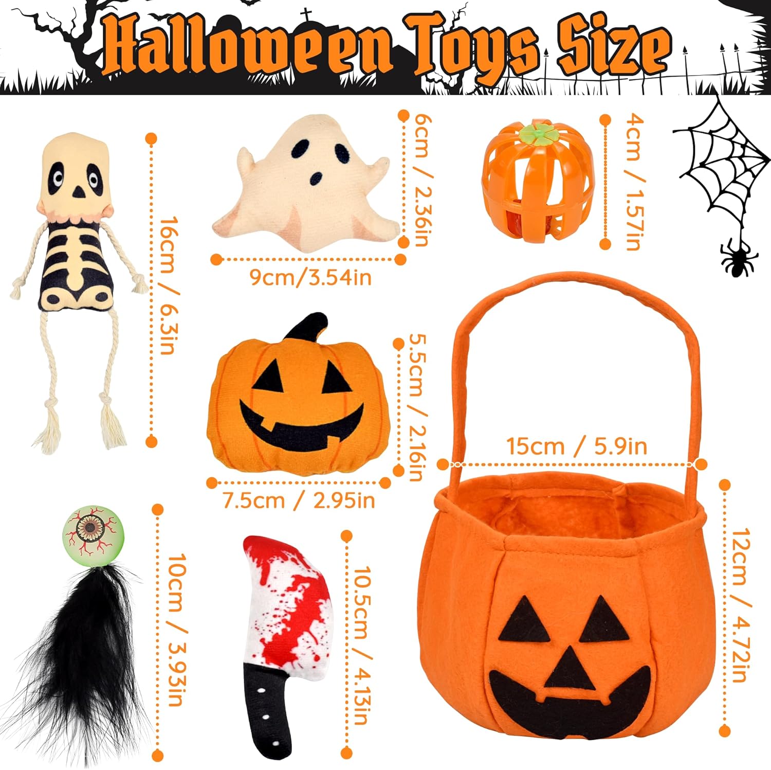 - 7PCS Halloween Cat Toys Set: A pumpkin bag, 3pcs horrible halloween cat catnip ghost,a eye-shaped feather, a pumpkin-shaped bell, a halloween knife
