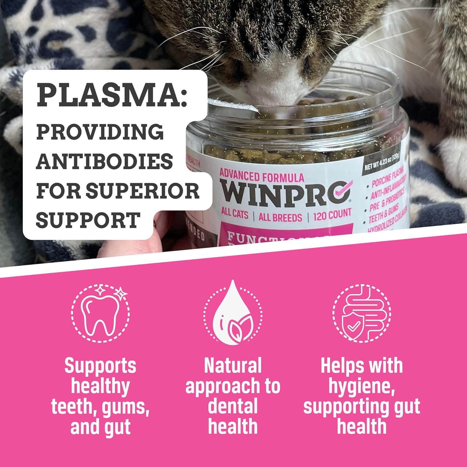 - ADVANCED DENTAL CARE FOR CATS: Contains 1-120 Count Canister of WINPRO Cat Dental Bites. Support better dental health in your cat with our unique formula that pairs plasma with other key ingredients to combat bacteria-induced inflammation in the mouth. These catnip- and chicken-flavored bites are not only tasty but also functionally work at the gum line, on the surface of the teeth, and in the gut, providing a comprehensive approach to your cat's dental health.