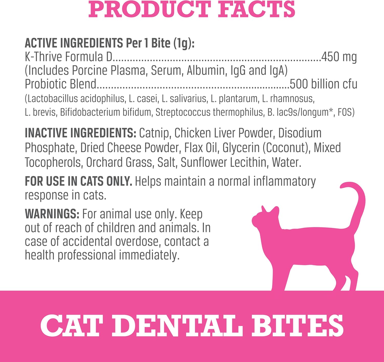 - PROVEN BENEFITS: These Dental Bites contain K-Thrive Formula D, a proprietary blend of animal blood proteins derived from plasma. The benefits of plasma have been studied for nearly half a century across various animal species in over 300 university studies. Our tasty cat bites support overall dental care and promote effective teeth cleaning for your feline friend. Additionally, the inclusion of probiotics enhances their digestive health and overall well-being.