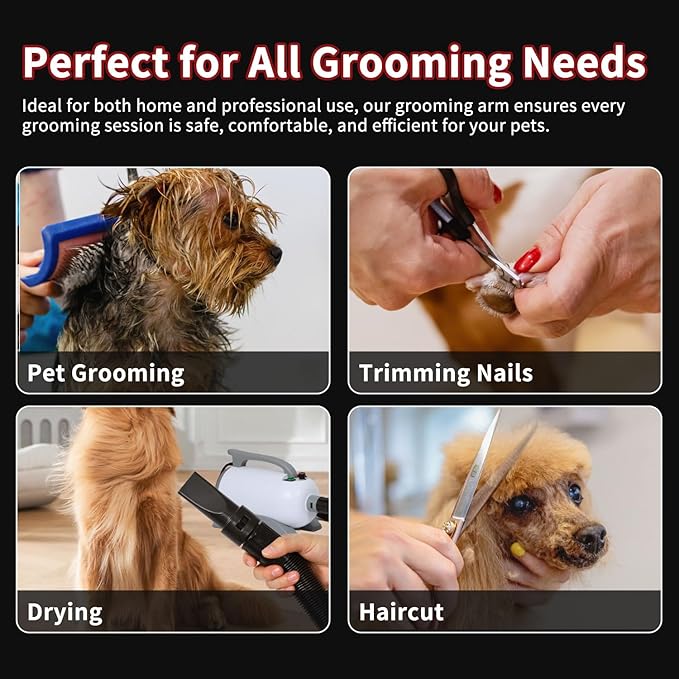 - Our multifunctional dog grooming arm is perfect for various grooming tasks such as haircuts, nail trimming, bathing, and drying. Whether you're a professional groomer or a pet owner, this grooming arm set is tailored to meet all your pet care needs.