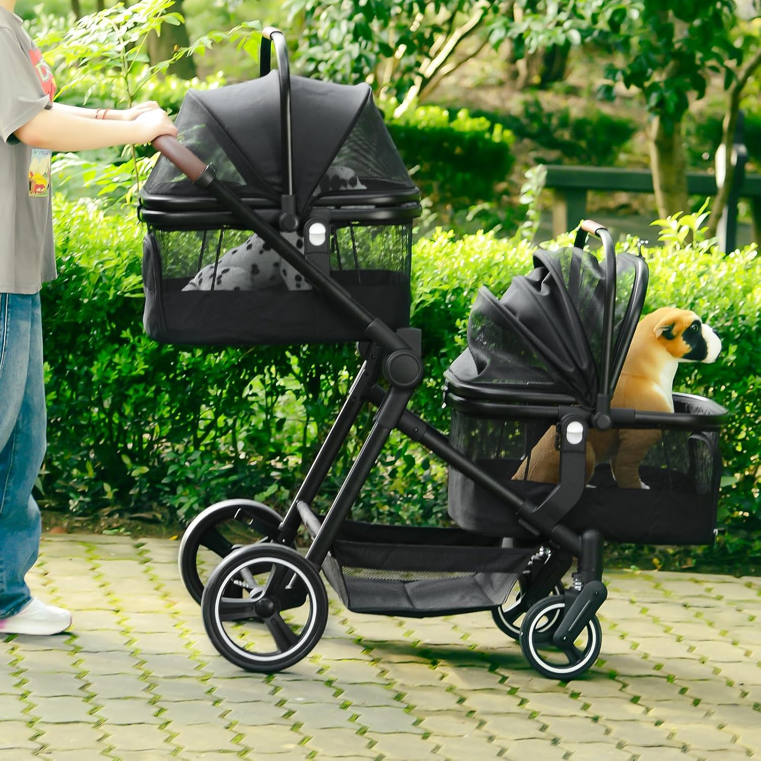 - 3 IN 1 Double Pet Stroller: Our dog stroller is the double-decker design to carry up to 2 small/medium pets. The baskets are detachable and can be pet carrier bags. You can be combined according to their different ways of going out, used as a double or single pet stroller, pet carrier bag, shopping cart