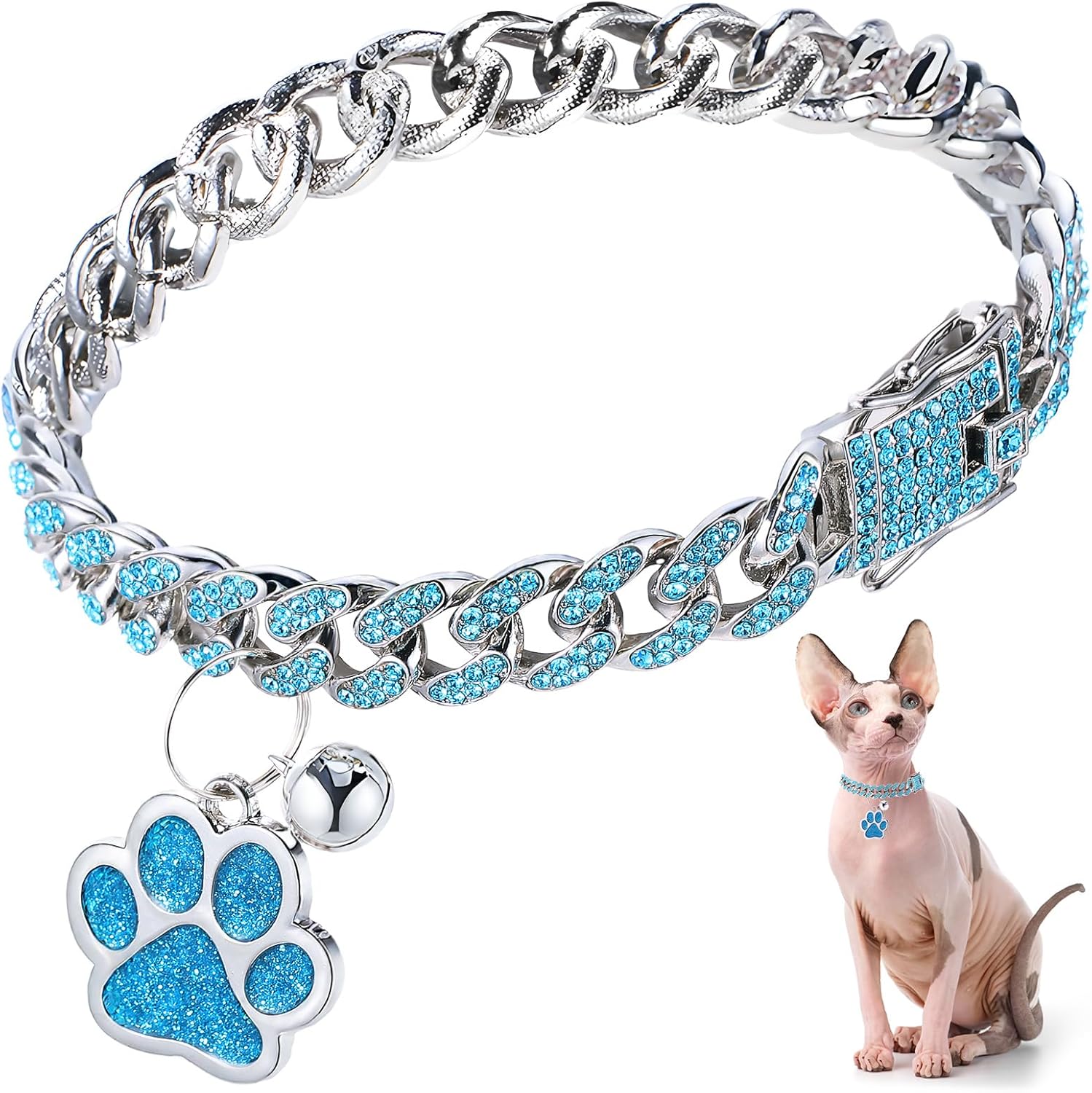 Hillban Cat Collar Diamond Chain Glitter Collar Walking Metal with Secure Buckle Cat Pet Necklace with Paw Charm and ID Tag Bell Link Cuban Jewelry Accessories(10 Inch,Silver,Lake Blue)