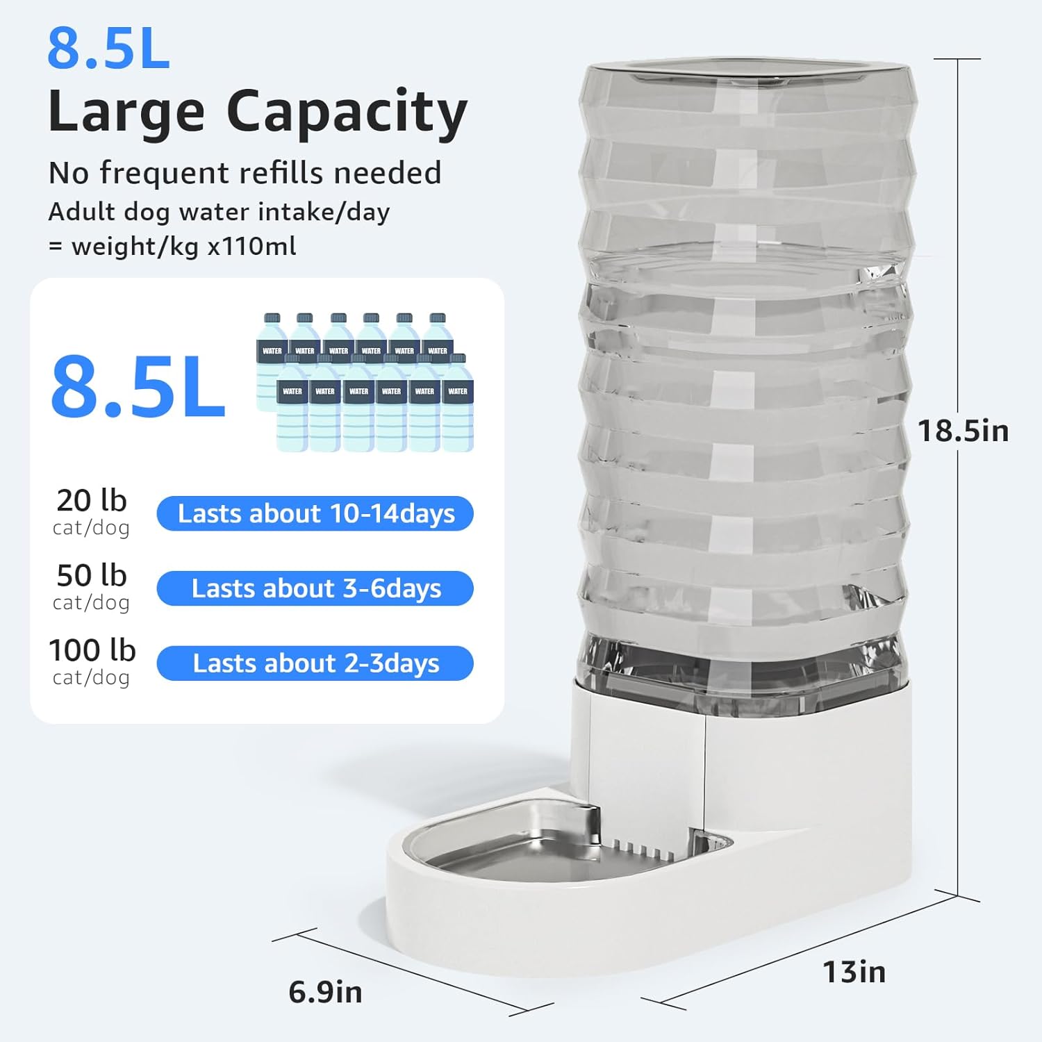 - 【More - 8.5L Dog Water Dispenser】8.5L pet water dispenser, can last 3-23 days for pets to drink according to their size. Even if you go out for a week, you don't have to worry about your pets without water. This pet waterer continues to provide your pet with high-quality water sources, free your steps, and make your travel worry-free.