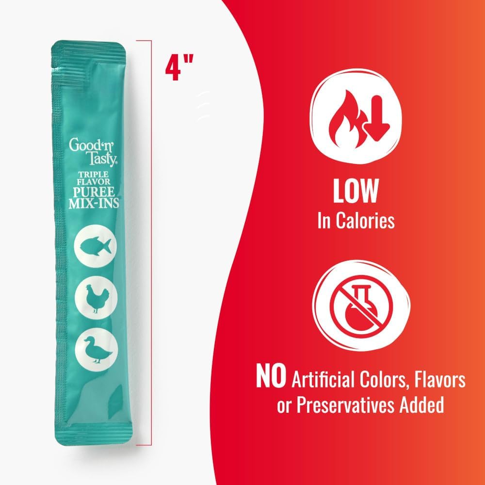 - DOG FOOD TOPPER TREATS: Good ‘n’ Tasty Triple Flavor Puree Mix-Ins enhance kibble’s taste and add flavor and protein to your pet's daily diet.