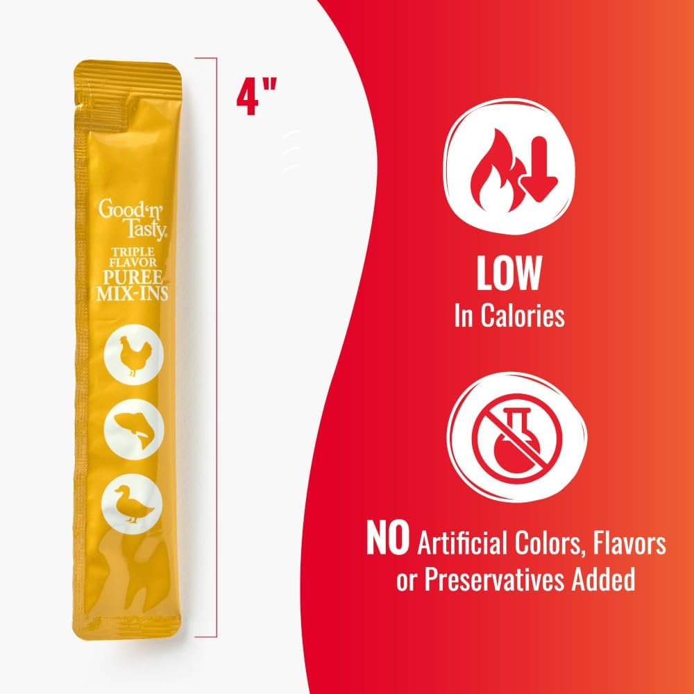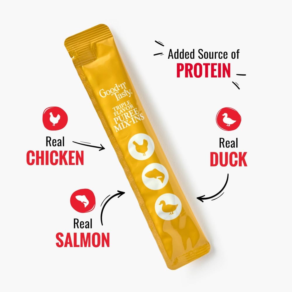 - DOG FOOD TOPPER TREATS: Good ‘n’ Tasty Triple Flavor Puree Mix-Ins enhance kibble’s taste and add flavor and protein to your pet's daily diet.