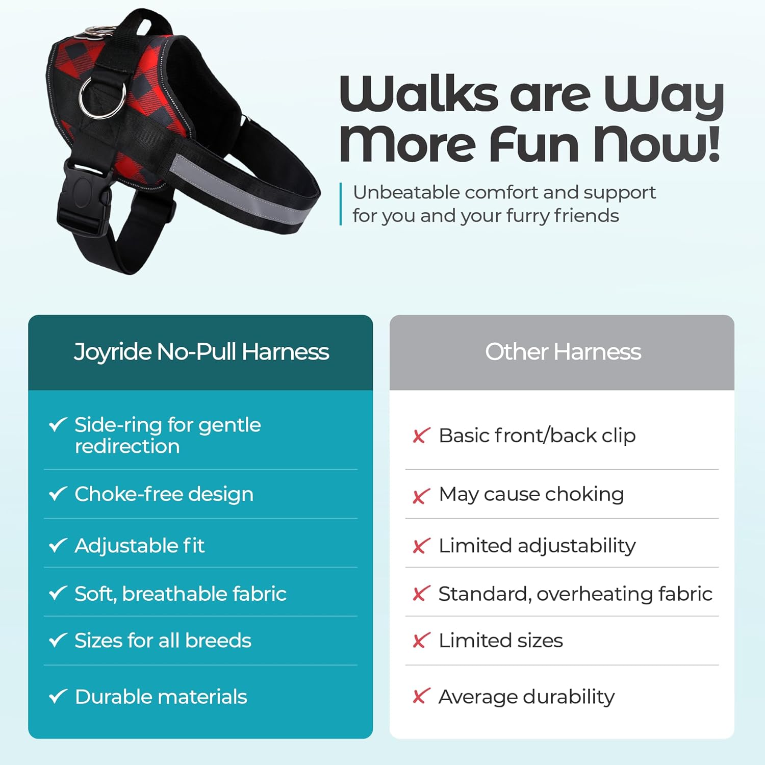 - [Unmatched Durability]: Crafted with your dog's safety at its core, and a lifetime of durability, the Joyride Harness is sturdy and built to last the test of time and energy. Featuring a sturdy Emergency Safety Handle, an advanced buckle closure system, and reflective material and stitching for added safety, our easy walk dog harness is built to ensure your adventures are safe, day or night.