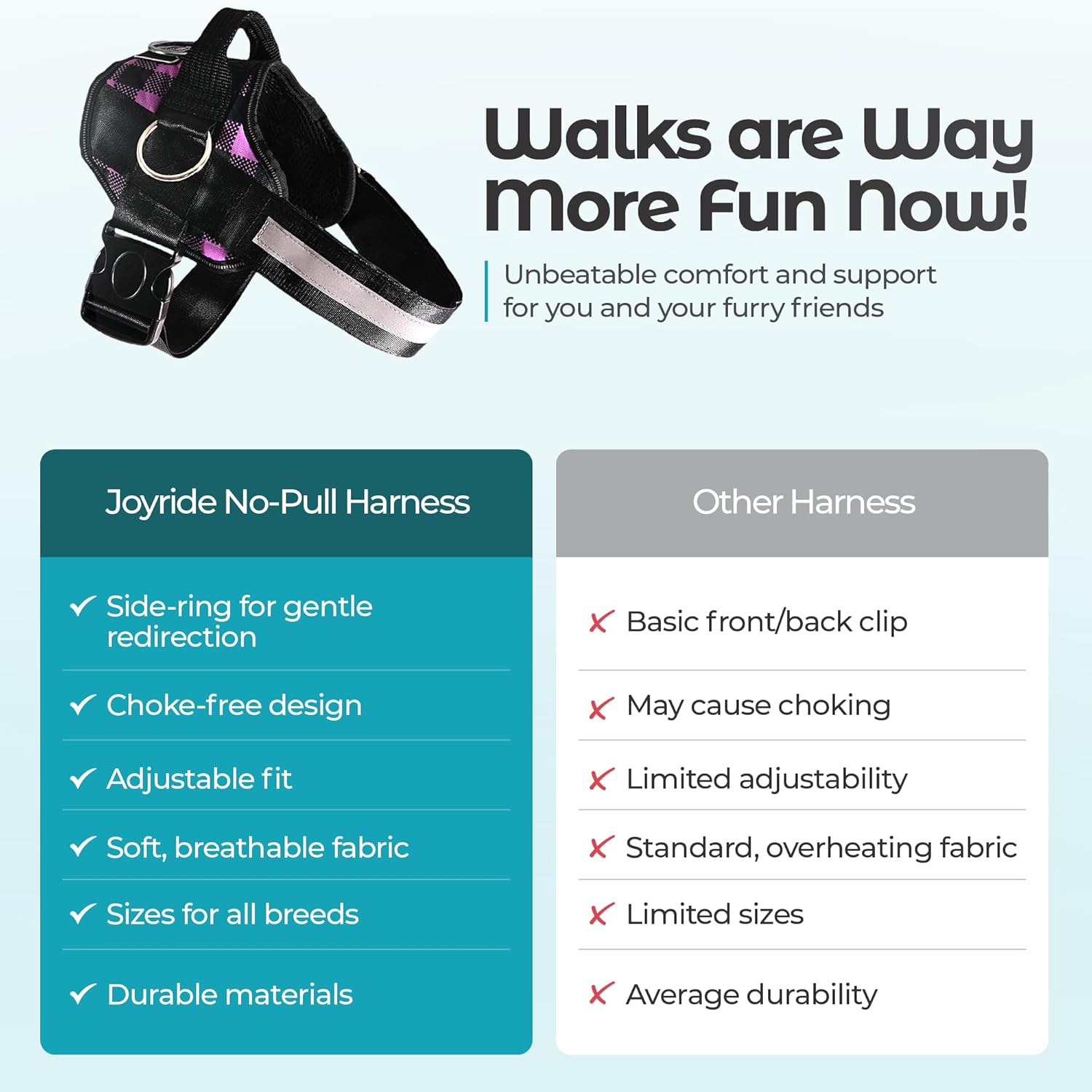 - [Unmatched Durability]: Crafted with your dog's safety at its core, and a lifetime of durability, the Joyride Harness is sturdy and built to last the test of time and energy. Featuring a sturdy Emergency Safety Handle, an advanced buckle closure system, and reflective material and stitching for added safety, our easy walk dog harness is built to ensure your adventures are safe, day or night.